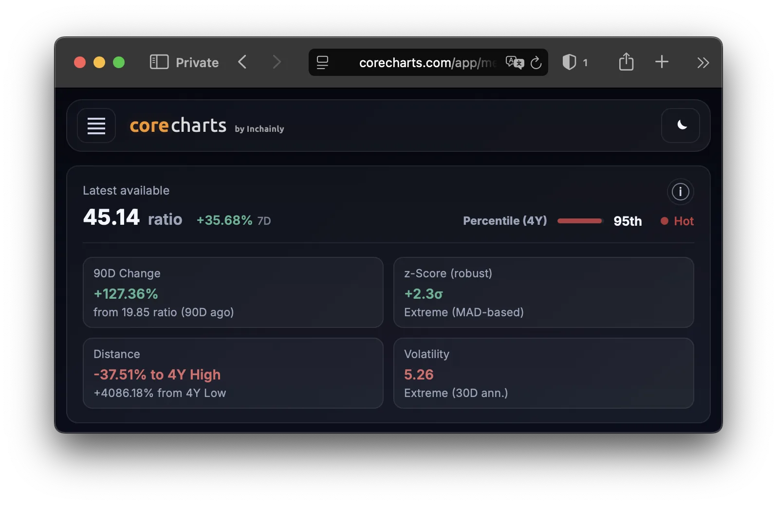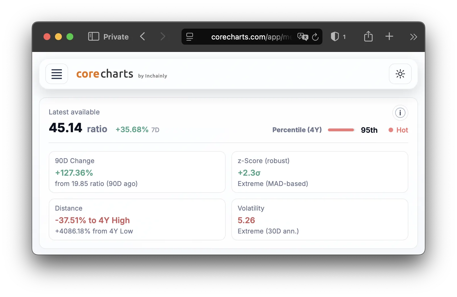 If the series is shorter than 4 years, all available history is used instead. If fewer than 90 observations are available, the percentile is hidden.