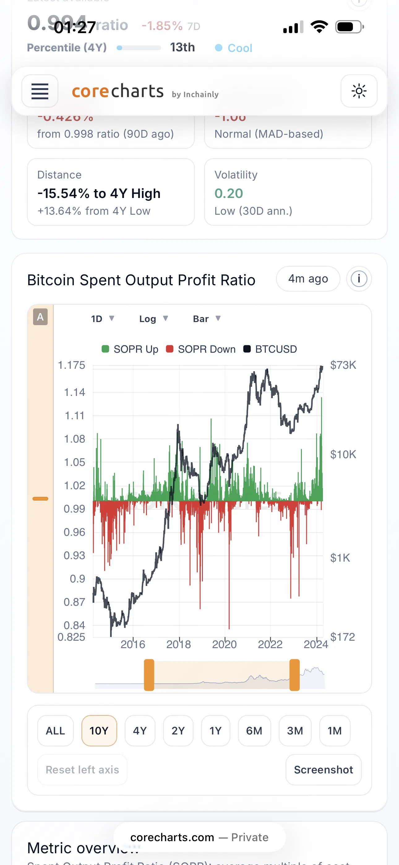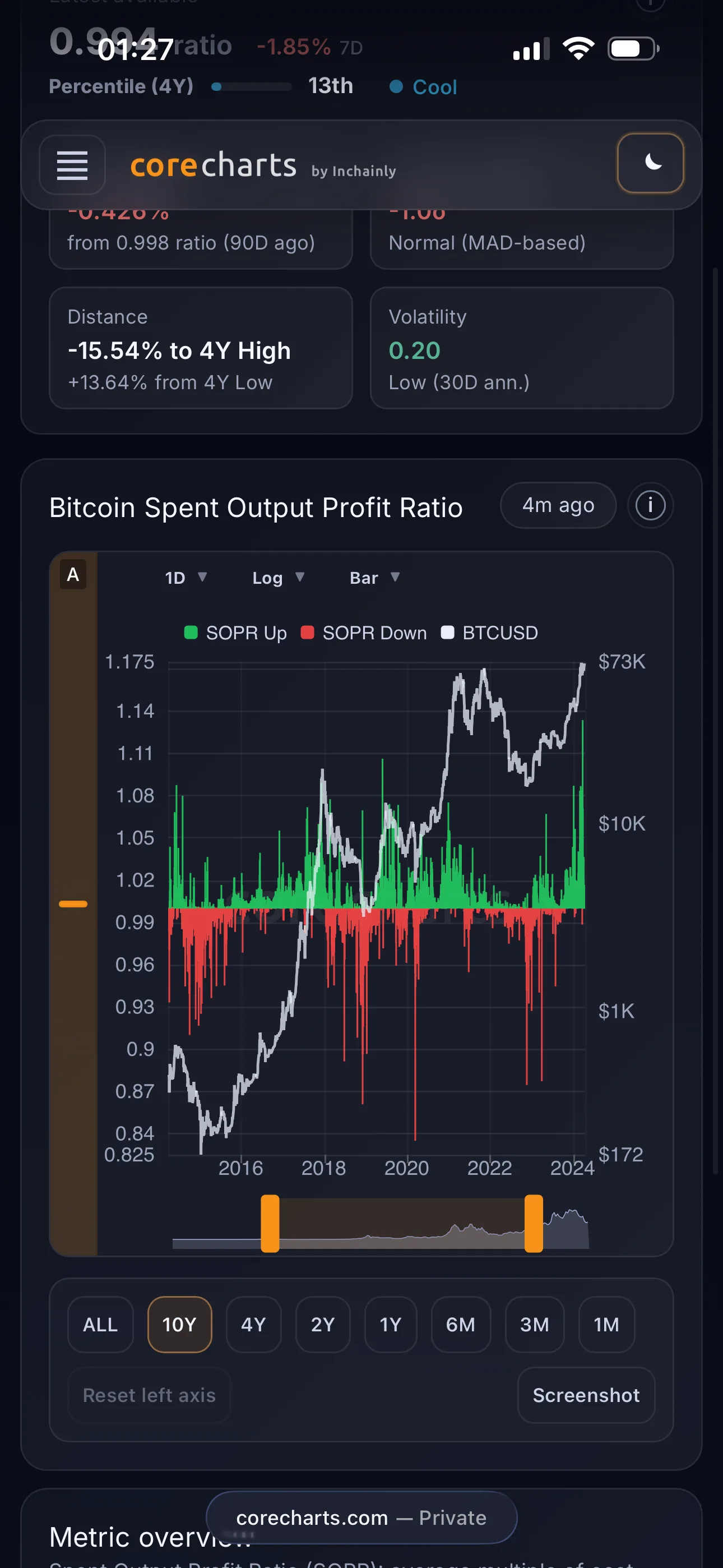 - a tooltip shows the date, metric value, and BTC price.