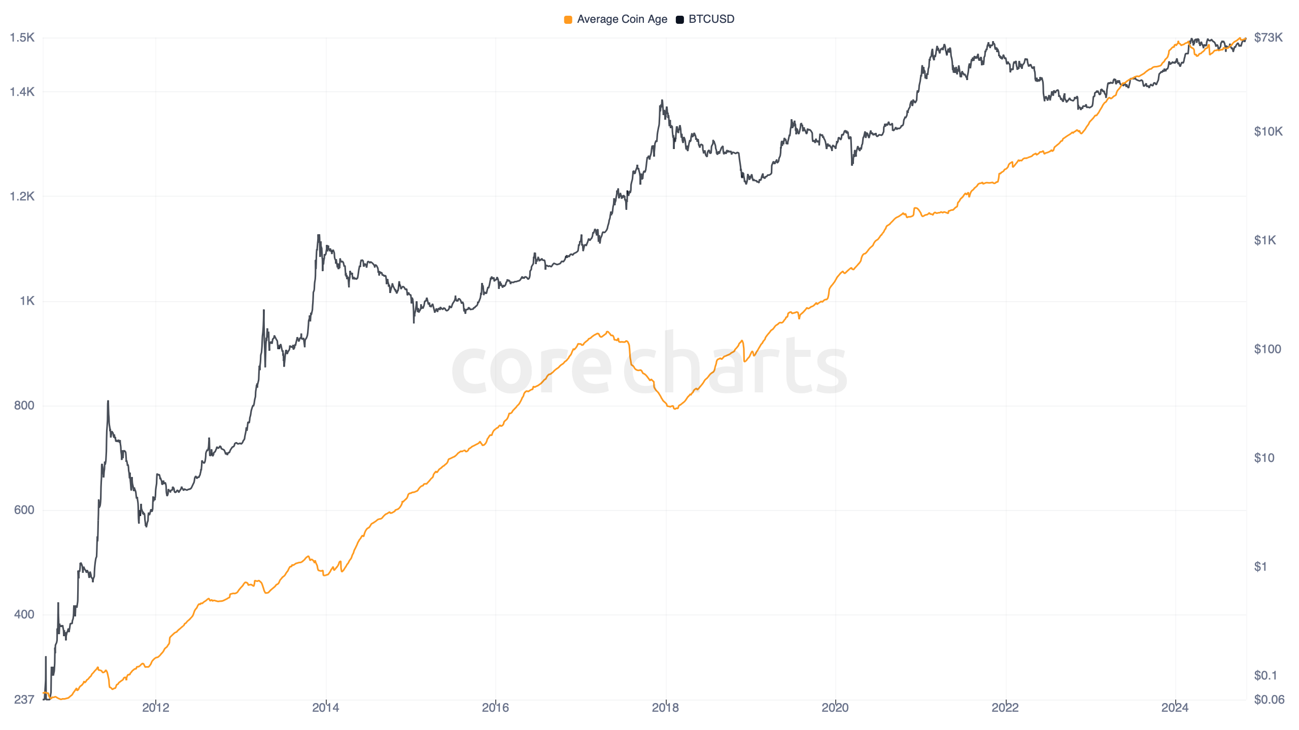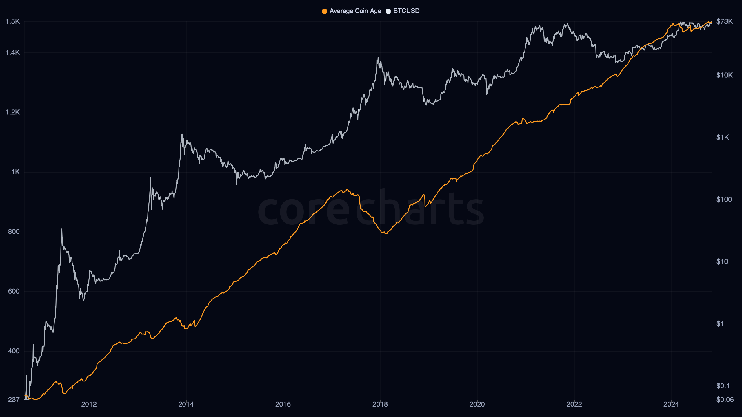 The idea of measuring average coin age comes out of the broader Bitcoin coin-age framework. Once analysts began working with coin-age destruction, dormancy, and held-supply age distributions, a natural follow-up was to summarize the age structure of held supply in a single statistic.