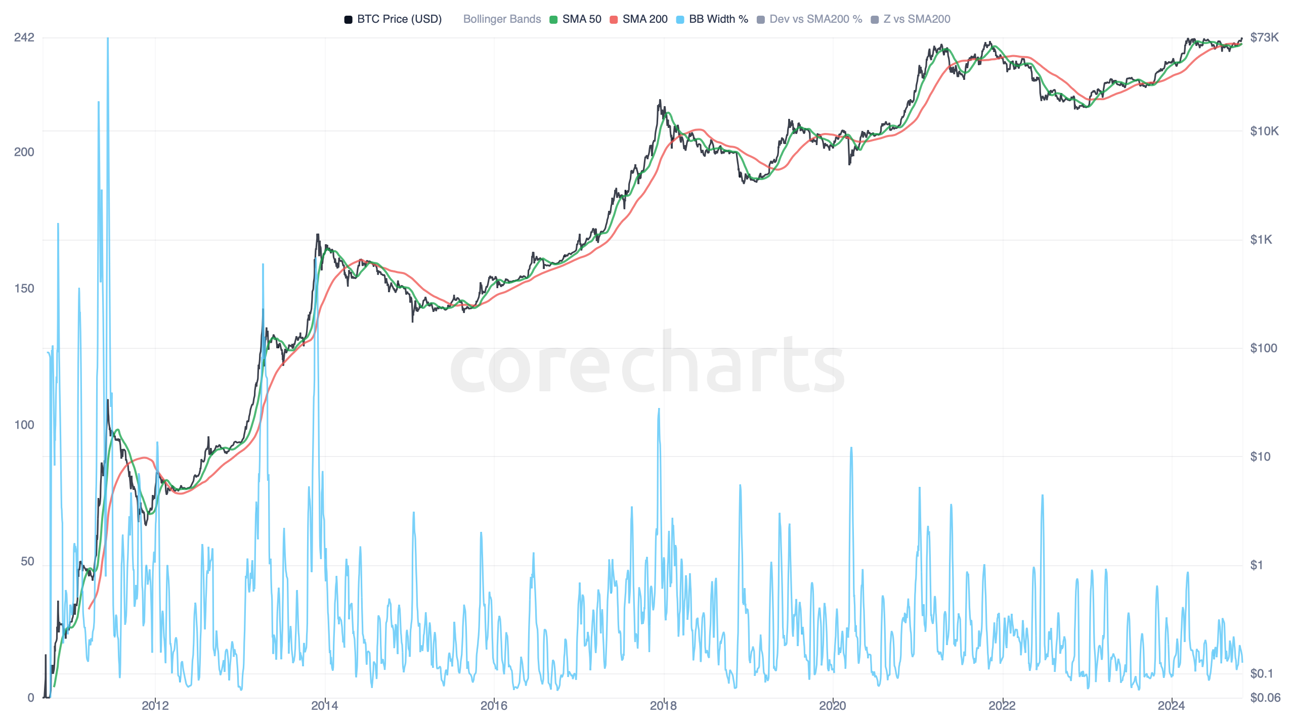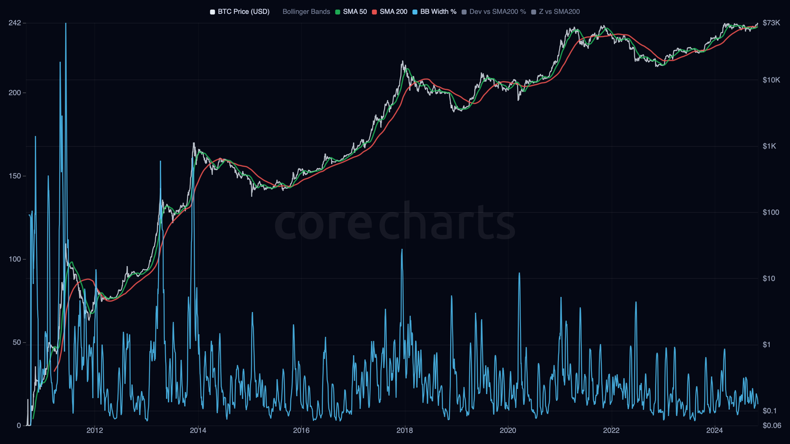 The 200-day moving average is a long-standing market convention in macro and crypto for defining structural trend regimes. Bollinger Bands were introduced by John Bollinger in the 1980s and are widely used to describe volatility expansion and contraction. BB Width is a standard derivative of Bollinger Bands designed to quantify compression and expansion regimes rather than only visual band placement.