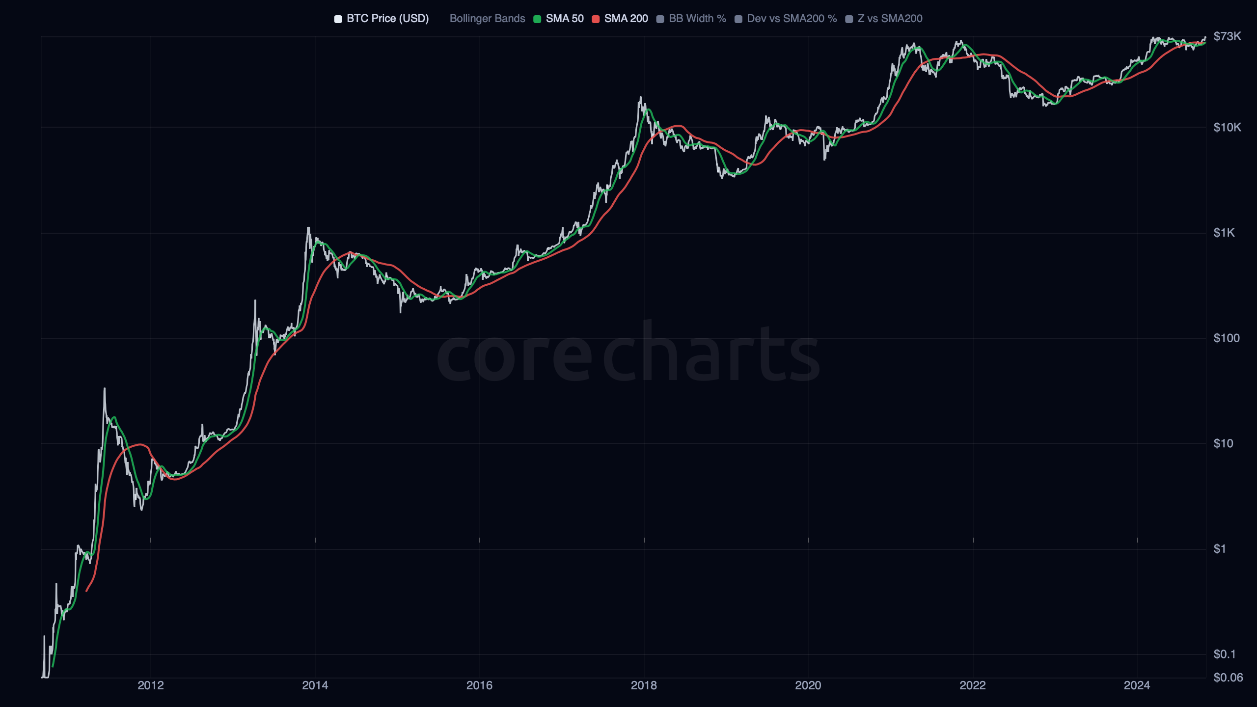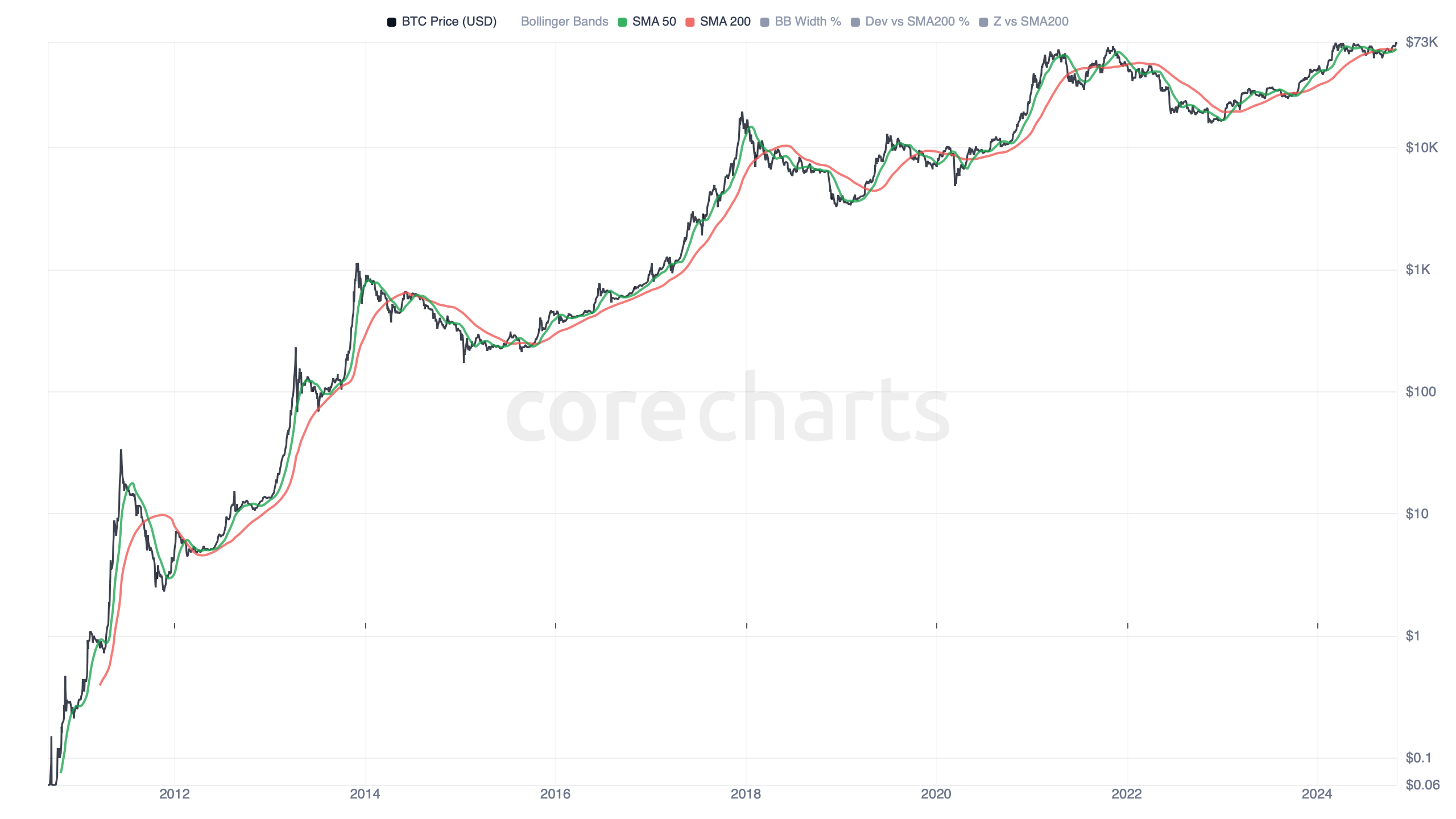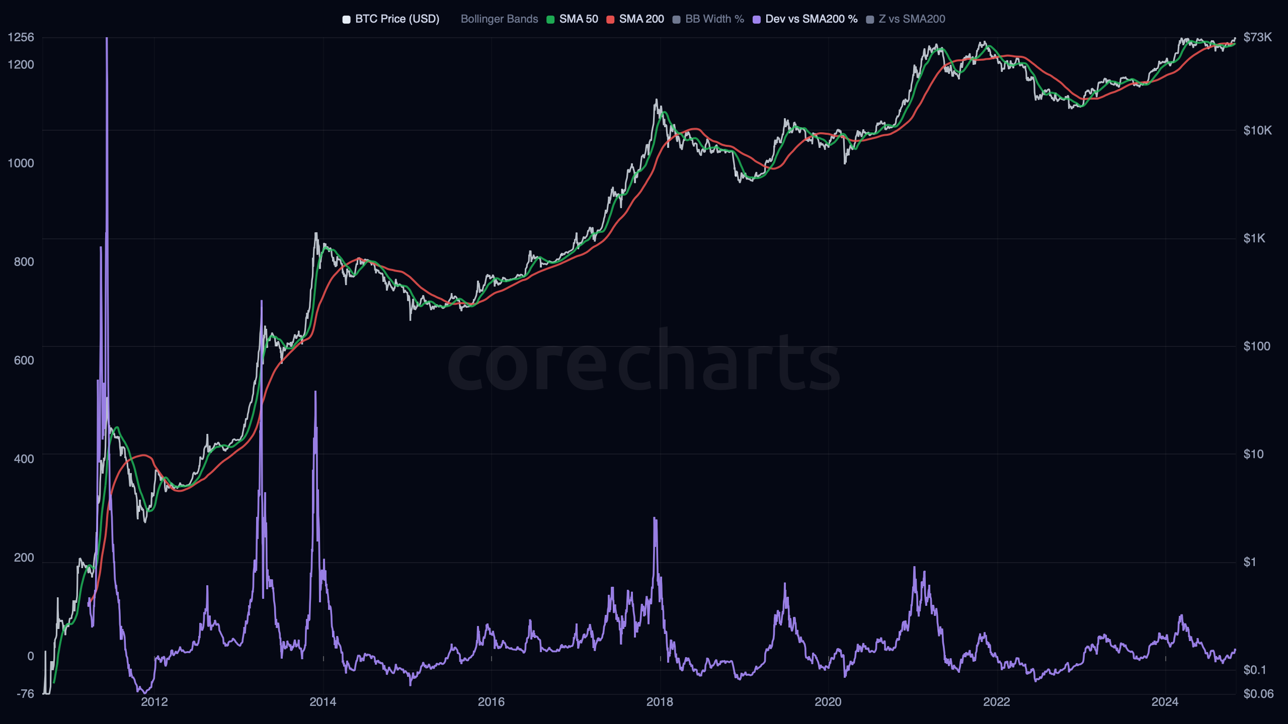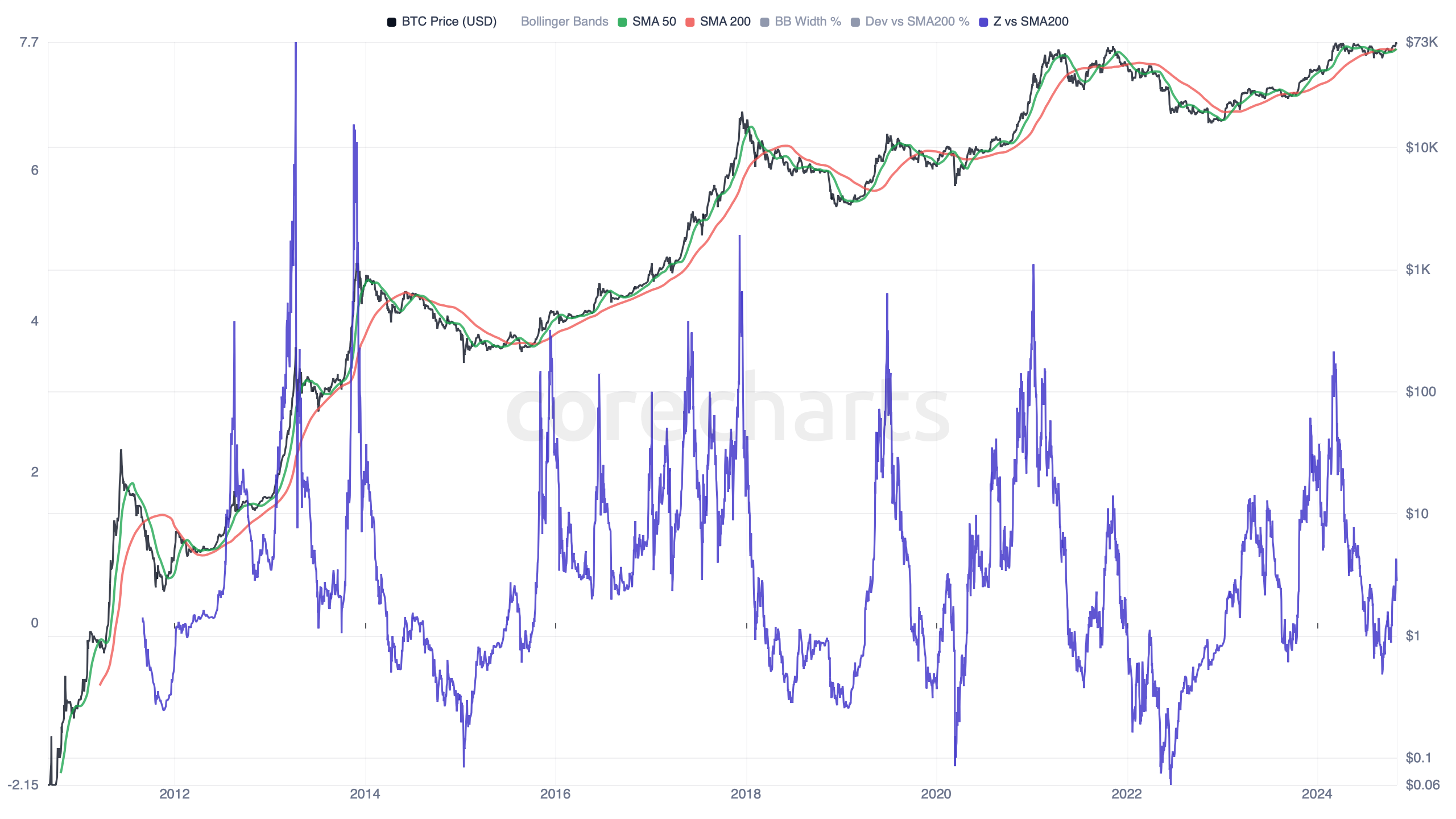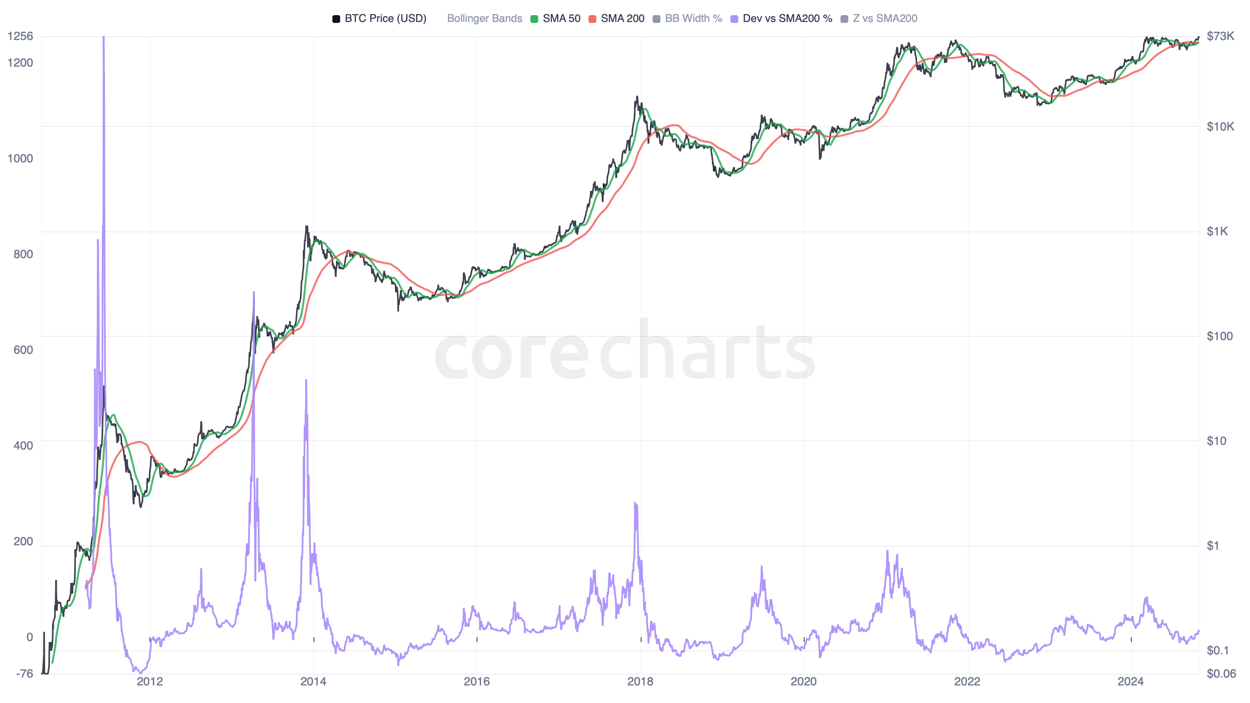 BTC Price (USD) is the daily Bitcoin reference price series used across CoreCharts for USD-denominated valuation work. This view adds a compact technical layer on top of price: SMA 50 and SMA 200 for trend context, Bollinger Bands (20,2) for dispersion around the 20-day mean, plus optional overlays that quantify volatility and distance from the long-term mean.