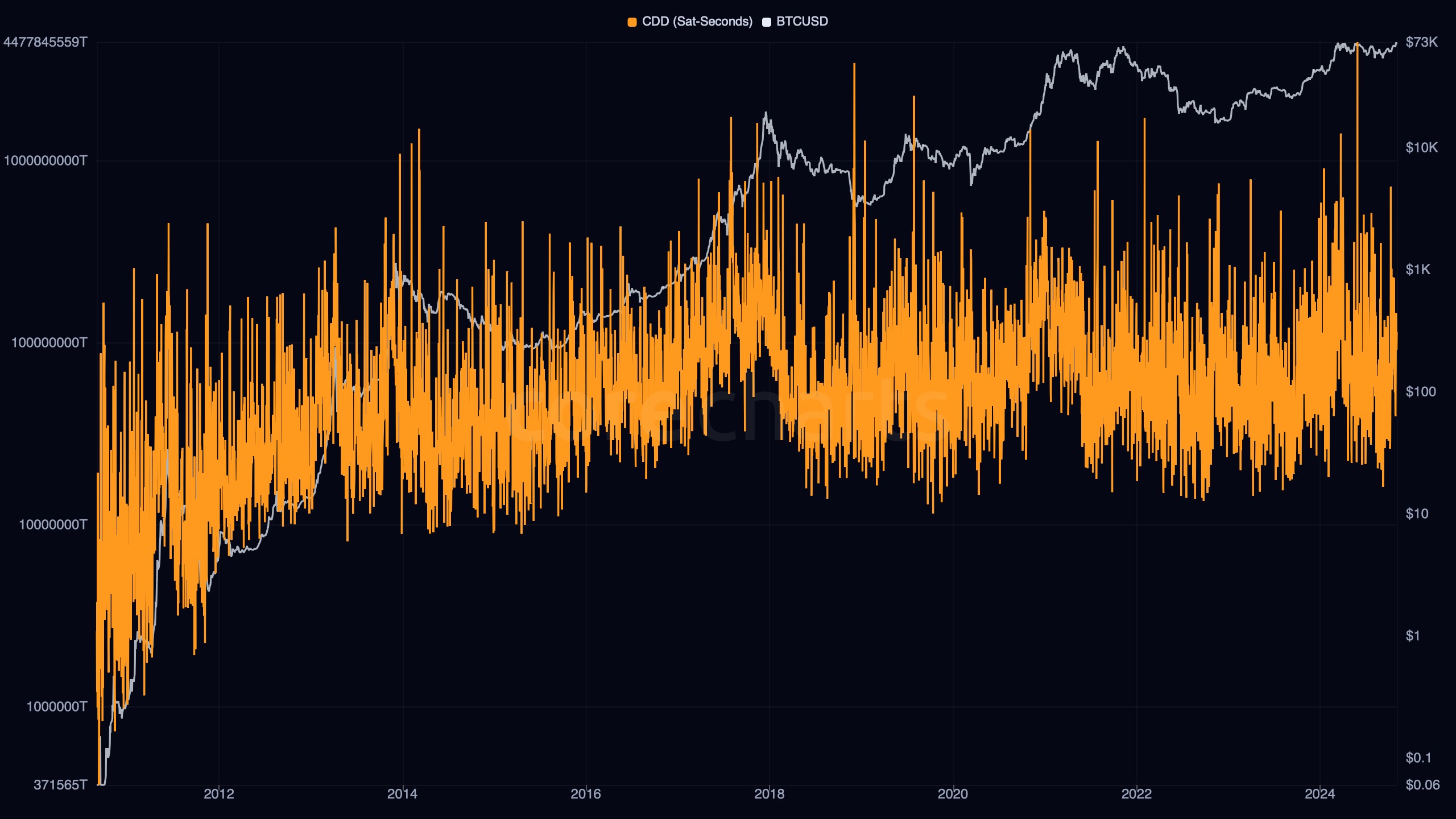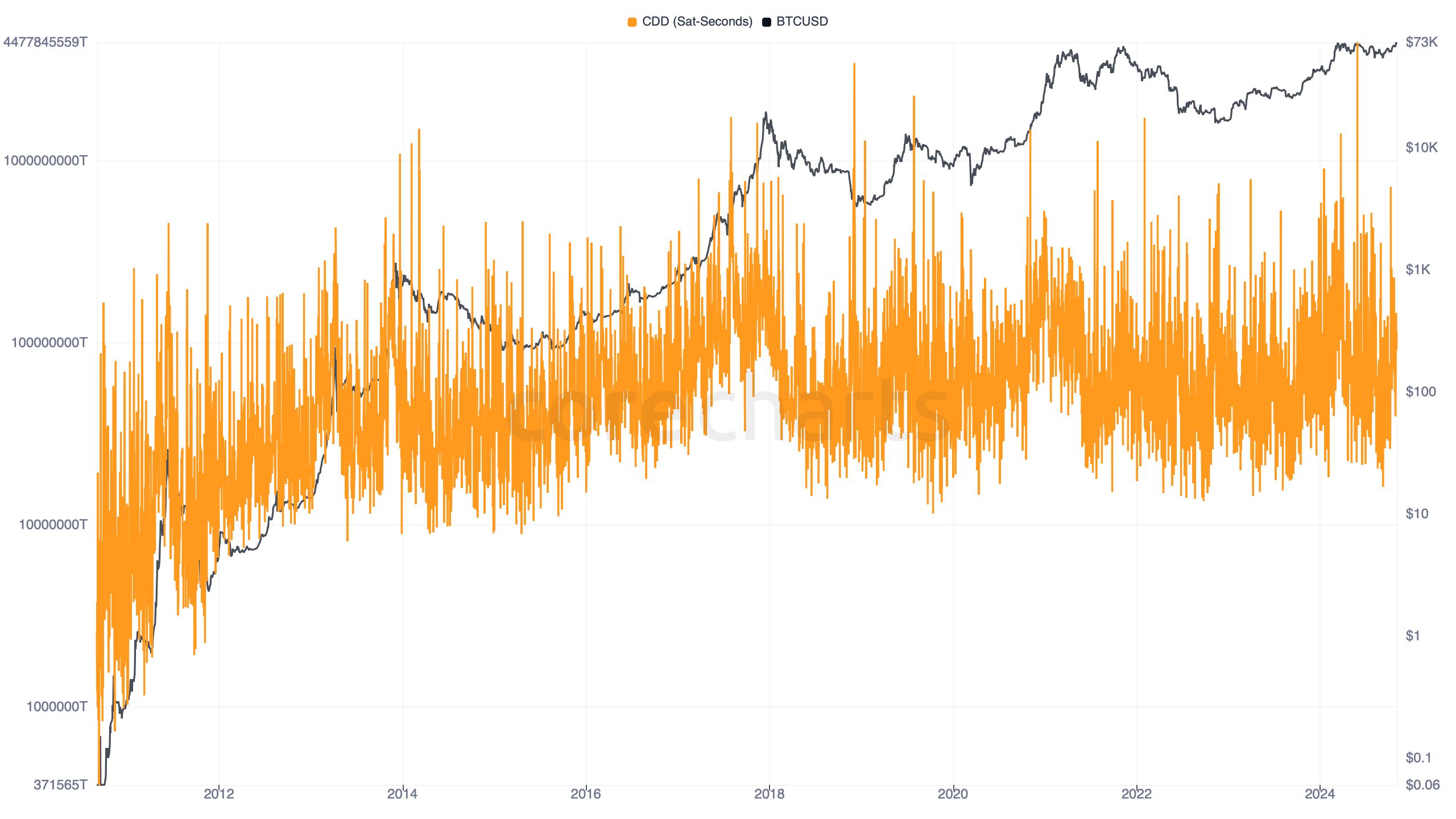 The better-known Coin Days Destroyed series expresses the same underlying logic in a more familiar unit. The sat-second version preserves the raw time-value magnitude of that process.