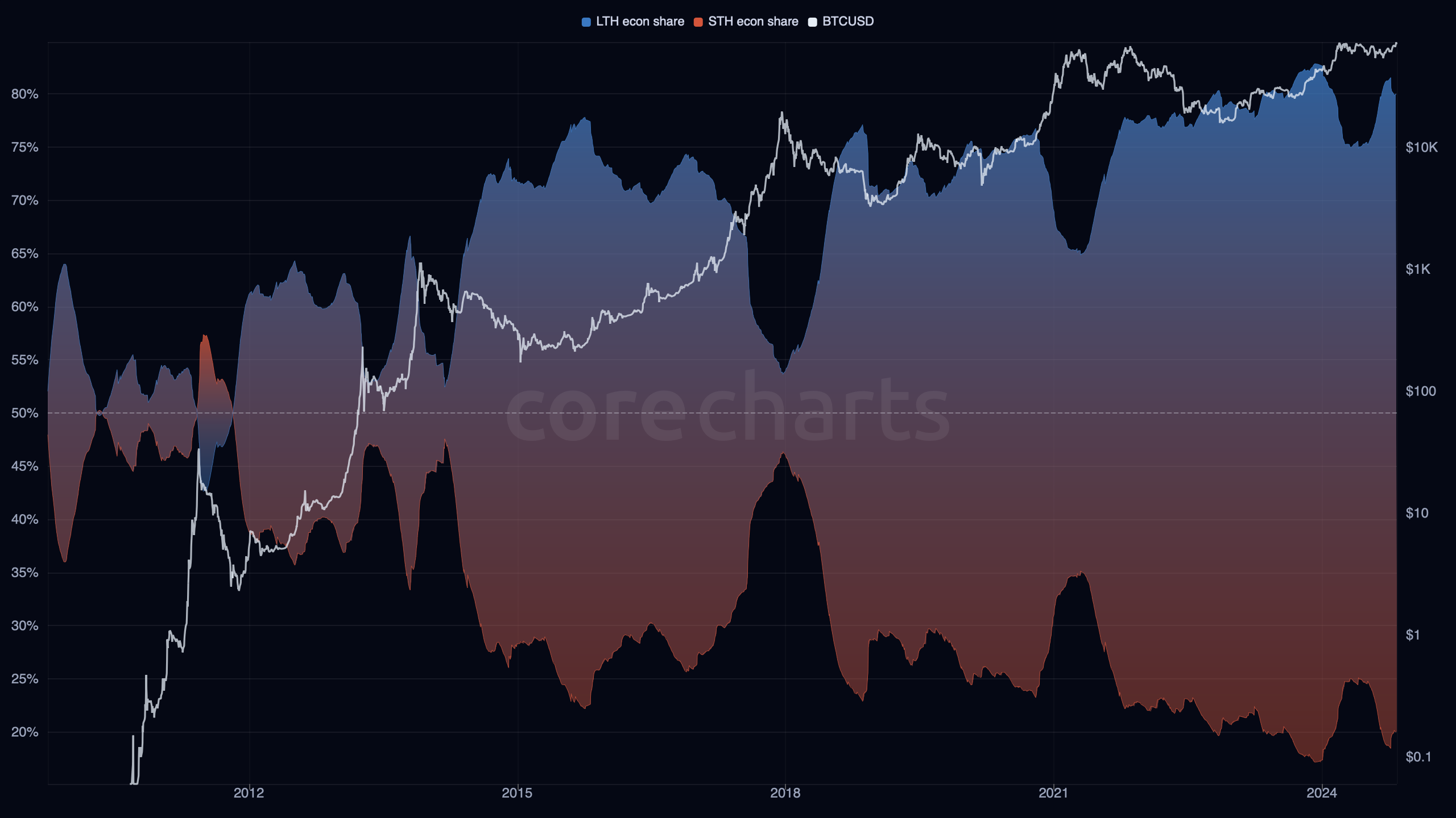 When the short-term share is elevated relative to the long-term share, a larger part of the economic supply base is sitting with recent holders. That usually points to a market with more recently redistributed supply and potentially more reactive positioning.