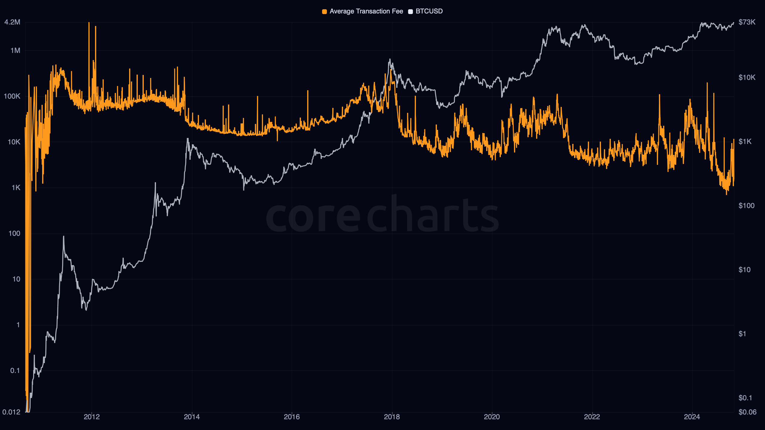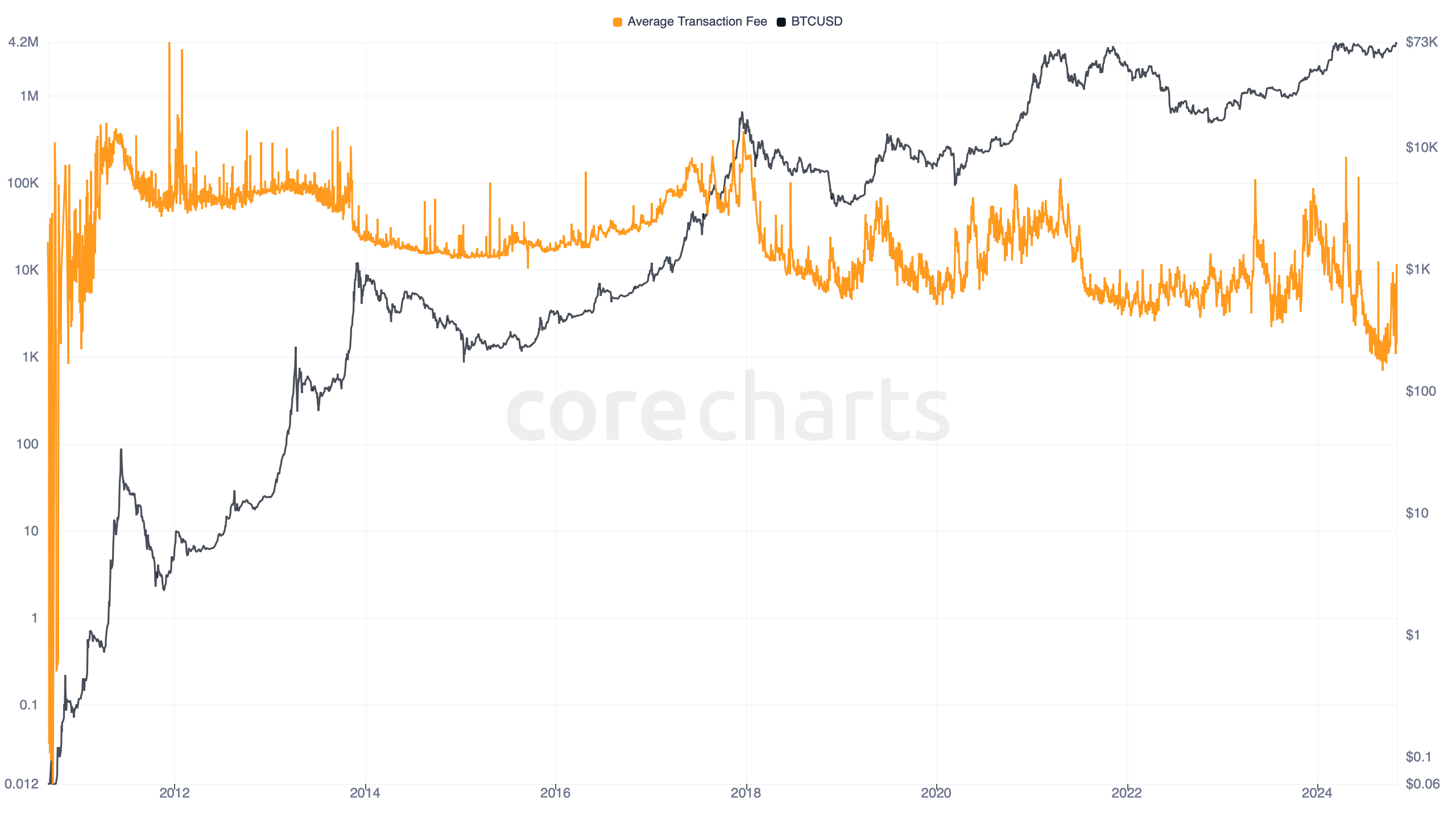 Bitcoin Average Transaction Fee shows the mean fee paid per Bitcoin transaction on a given day.