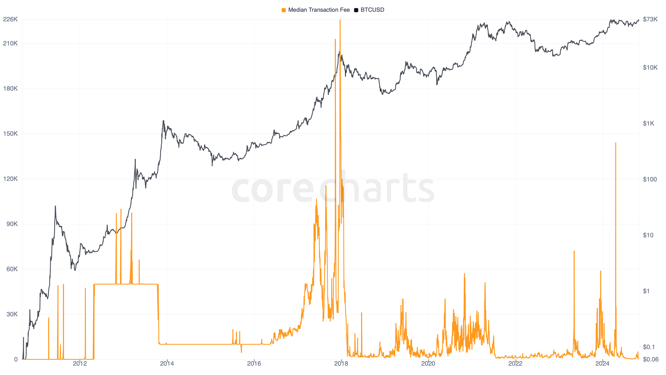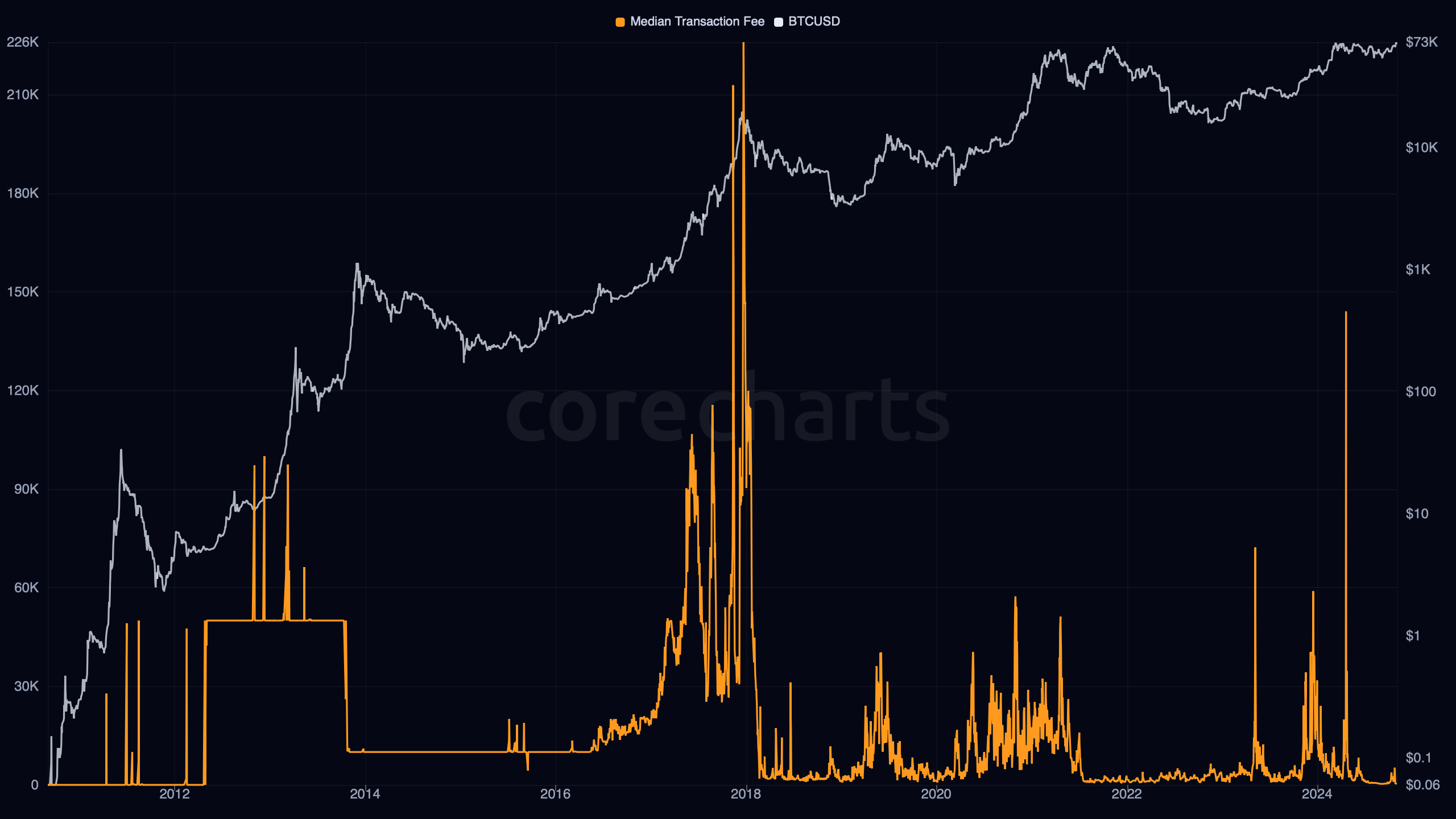 Bitcoin Median Transaction Fee shows the median fee paid per Bitcoin transaction on a given day.