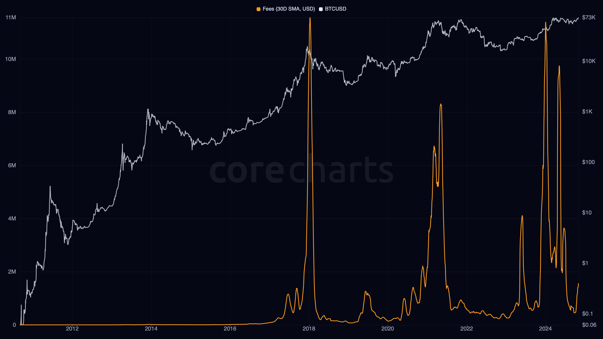 The 30-day version is better than the 7-day average for judging whether the fee market has genuinely shifted regime. It is the more useful line when the question is not “what happened this week?” but “has fee support really changed over the last month?”