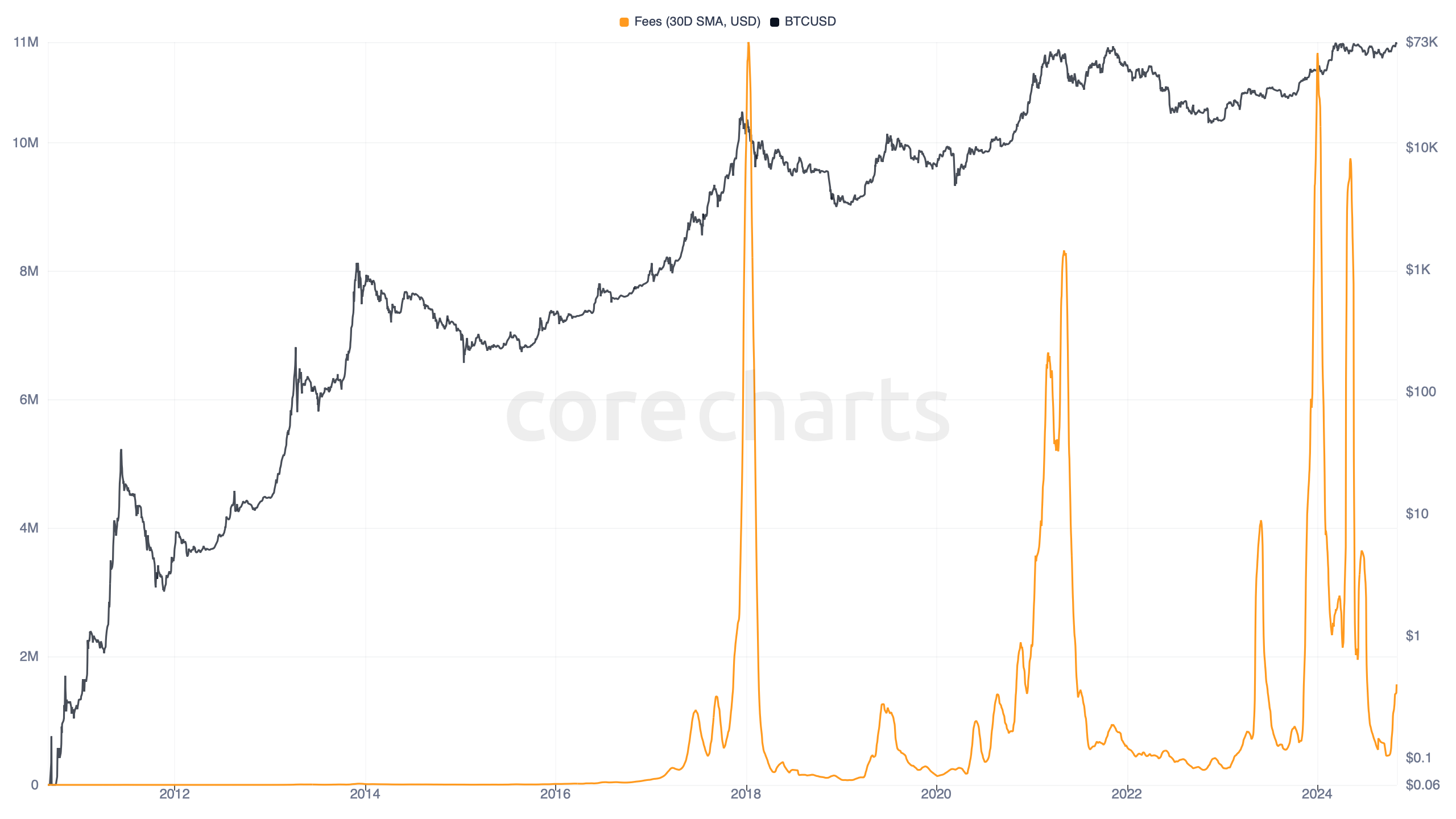 Longer moving averages of fee revenue became standard once analysts began treating the fee market as a structural component of miner economics rather than as a series of isolated spikes. A 30-day window is especially useful because it captures the monthly fee backdrop without overreacting to temporary bursts of demand.