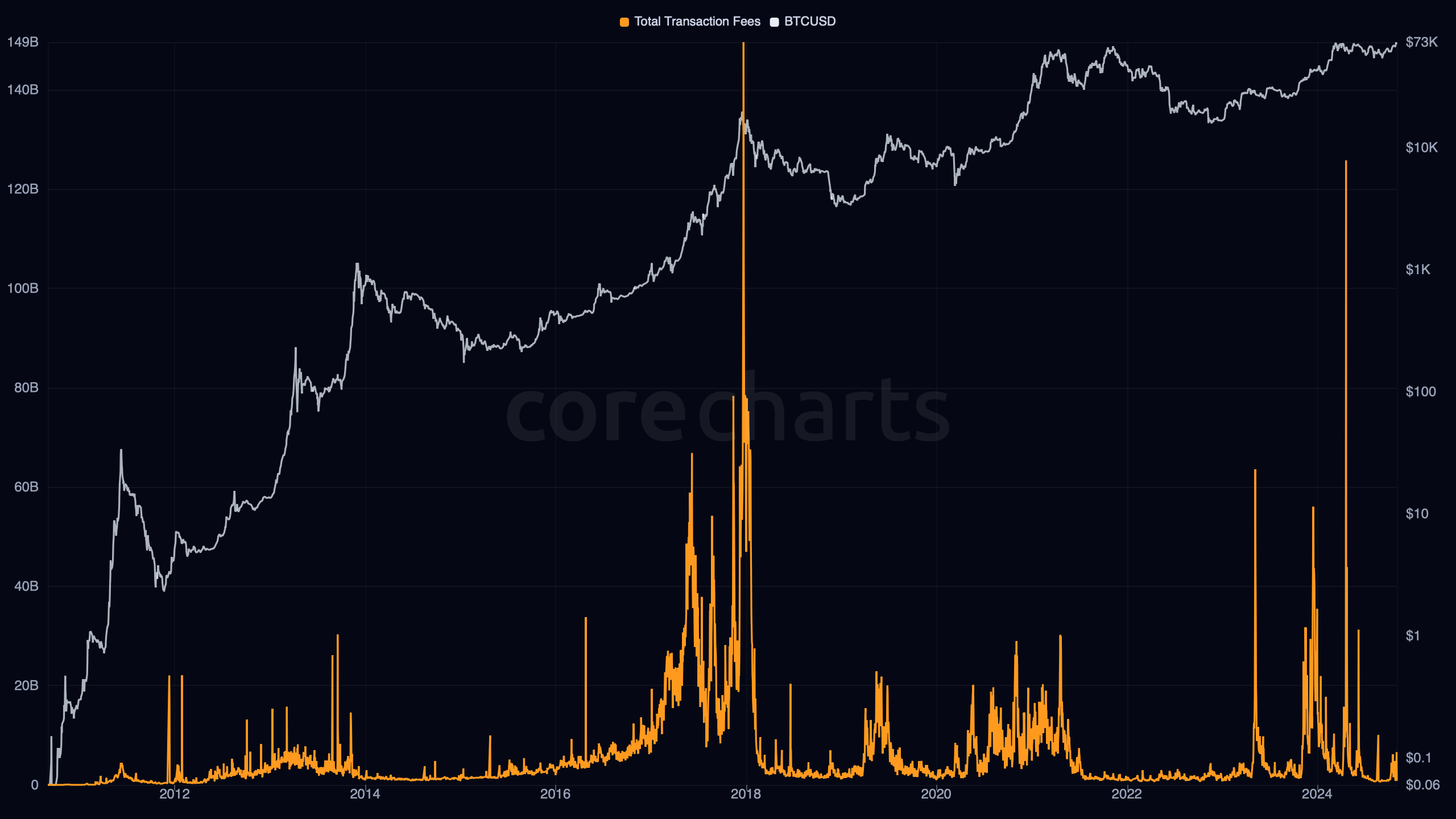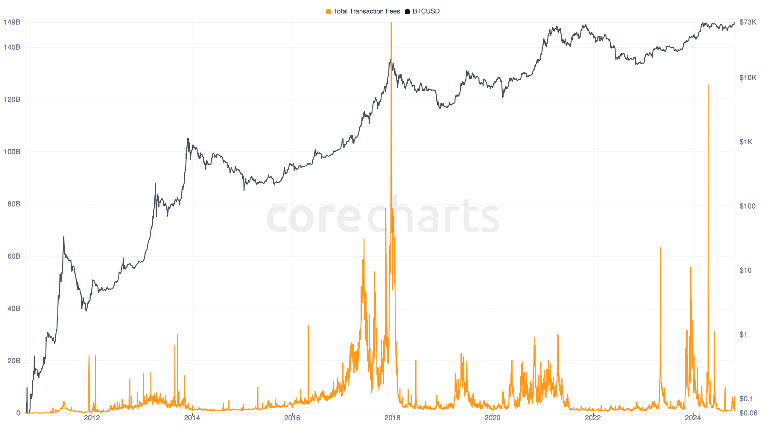 Bitcoin Total Transaction Fees shows the total amount of fees paid by Bitcoin transactions over the observed day.