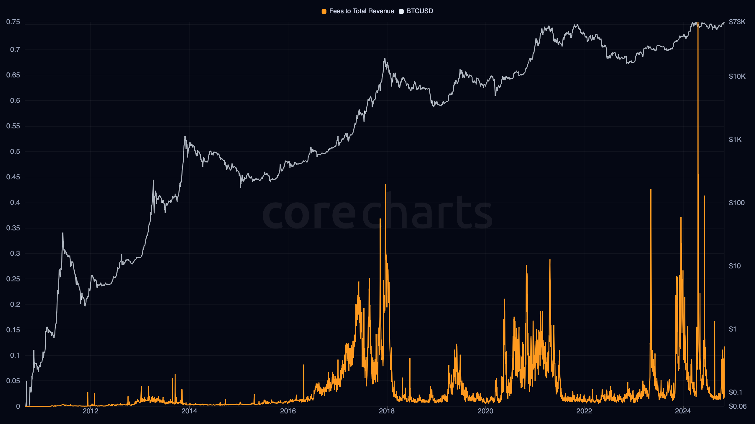 The fee-share view is often easier to interpret than raw fee totals because it directly shows the composition of miner income.