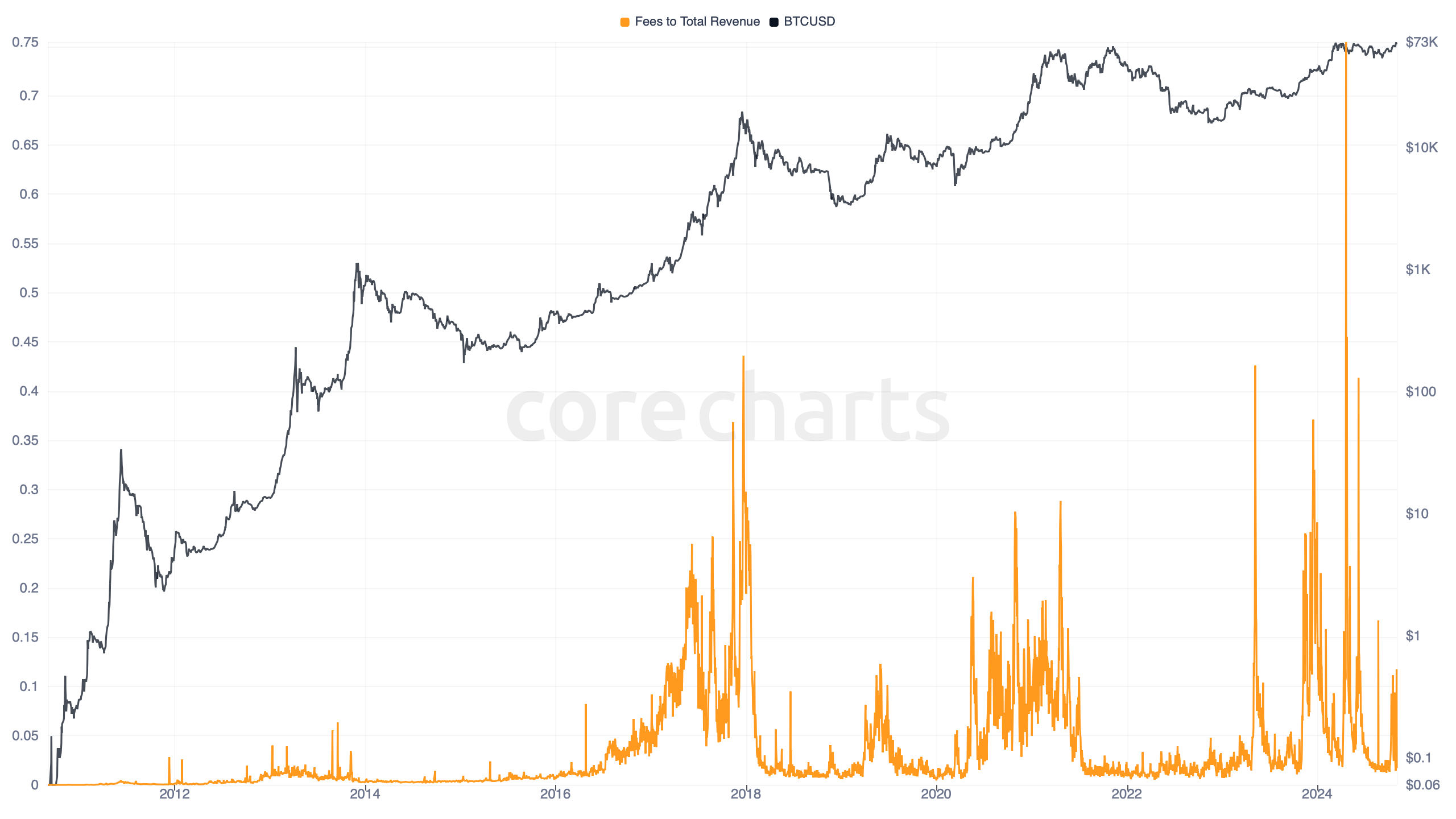 A high reading means fees contributed a large share of total miner income. A low reading means miner revenue remained mostly subsidy-driven.