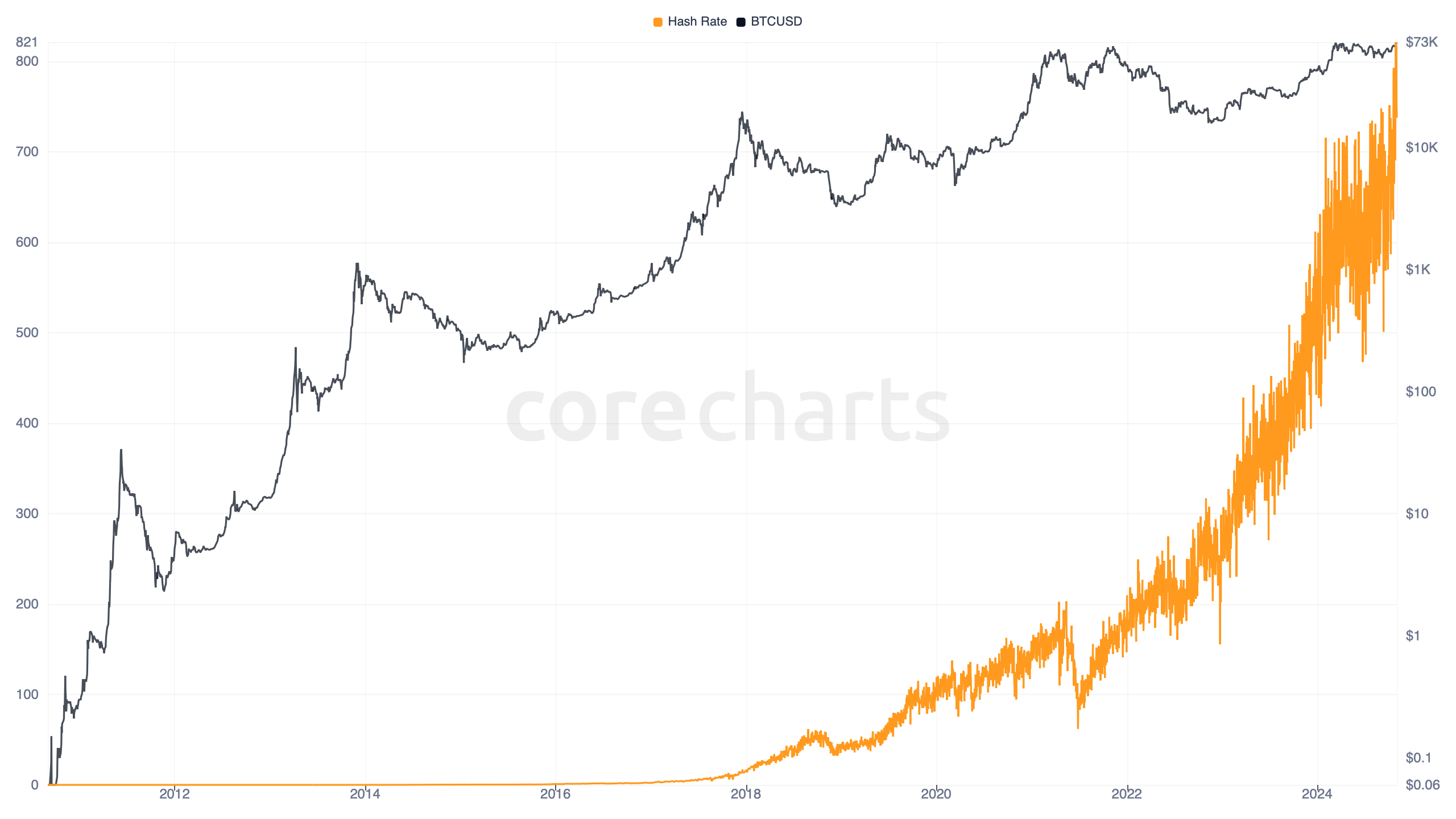 In CoreCharts, the estimate is derived from the observed block interval and the current mining difficulty. The result is shown in exahashes per second (EH/s).