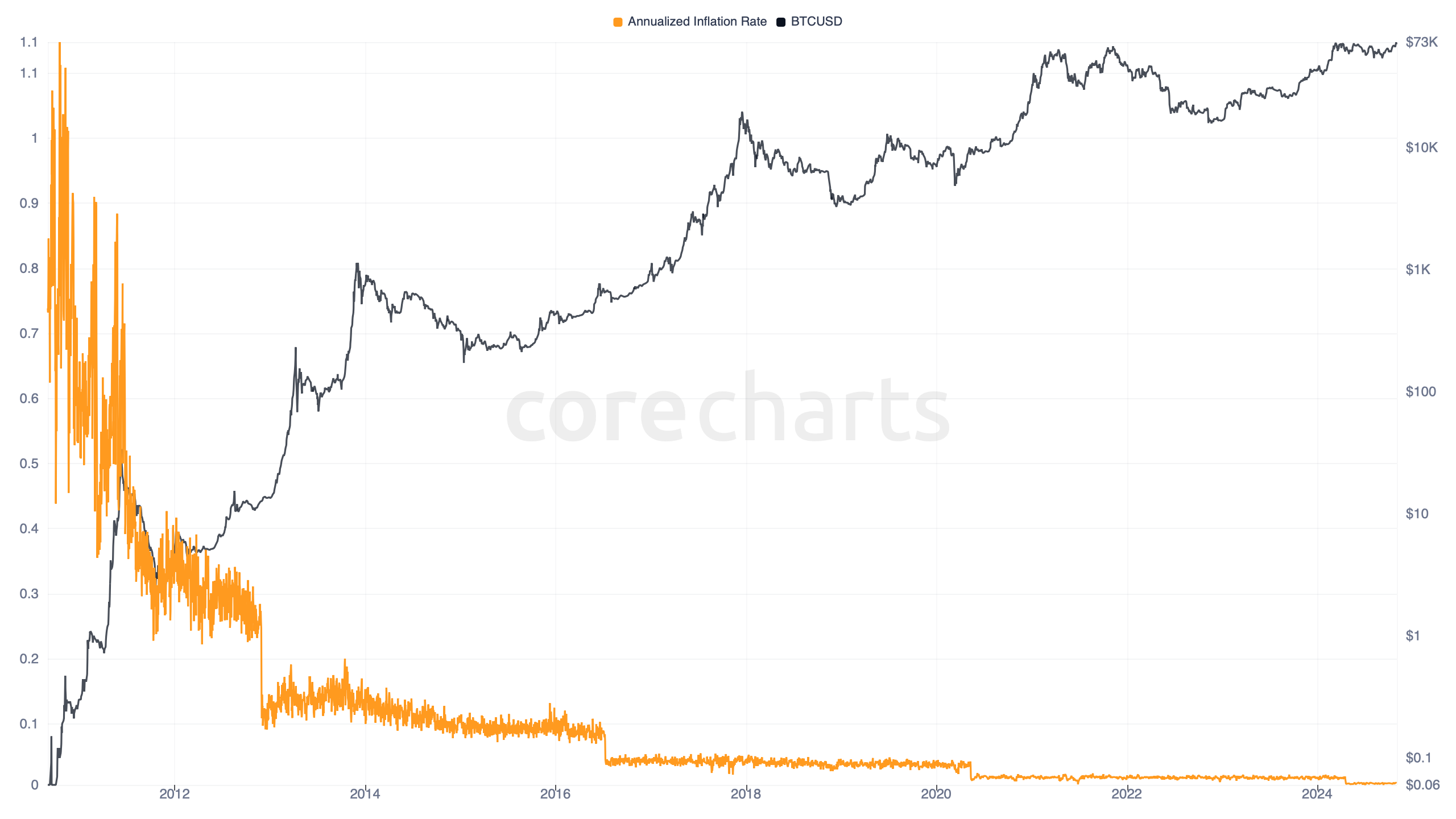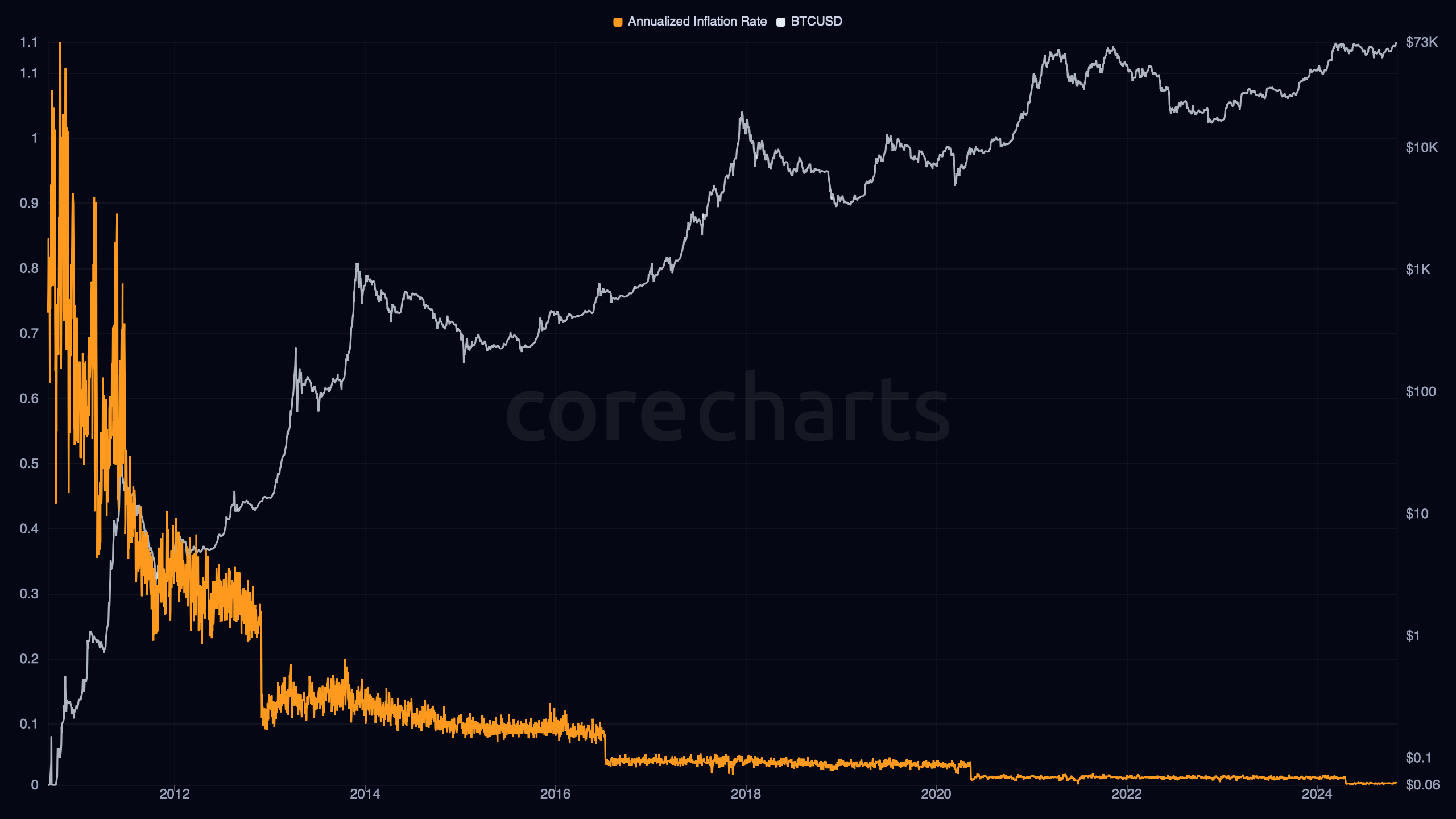 The most important moves in this metric occur around halvings. Each halving reduces issuance relative to supply, which lowers the annualized inflation rate.