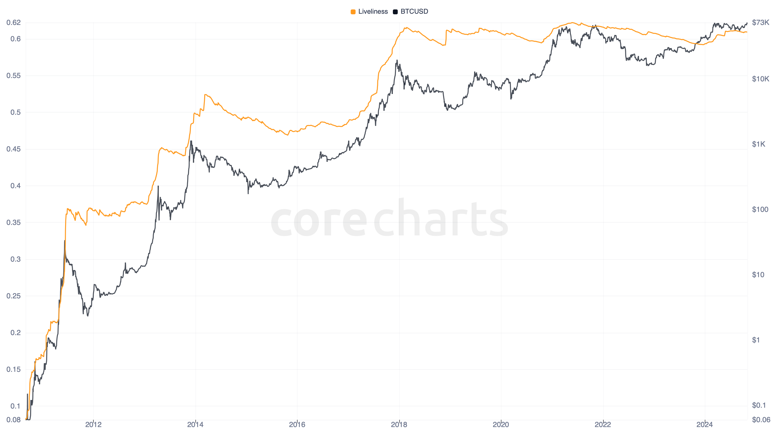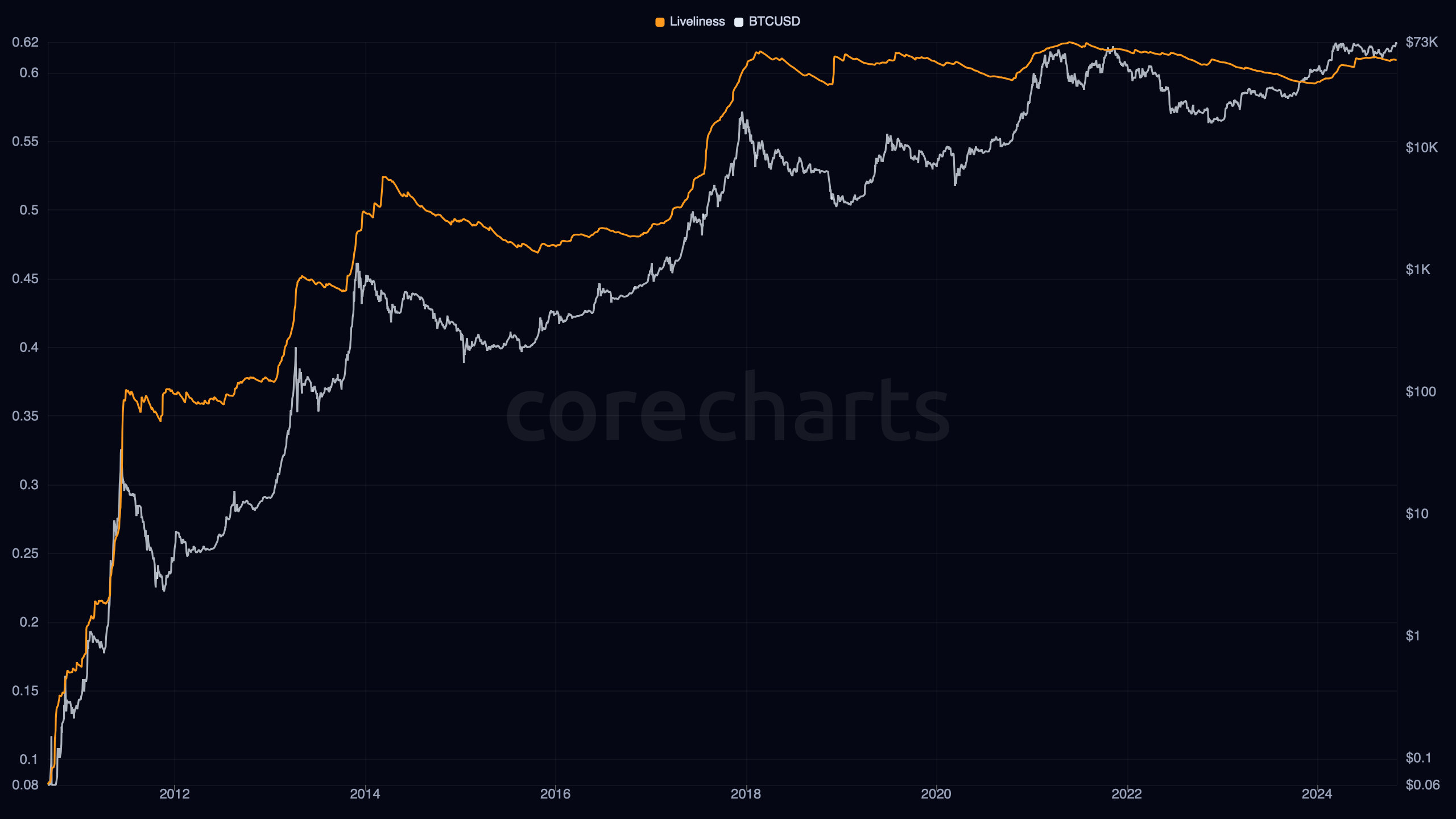 Bitcoin Liveliness measures how much of Bitcoin’s accumulated coin-age has been destroyed by spending, relative to how much coin-age the network could have accumulated in total.