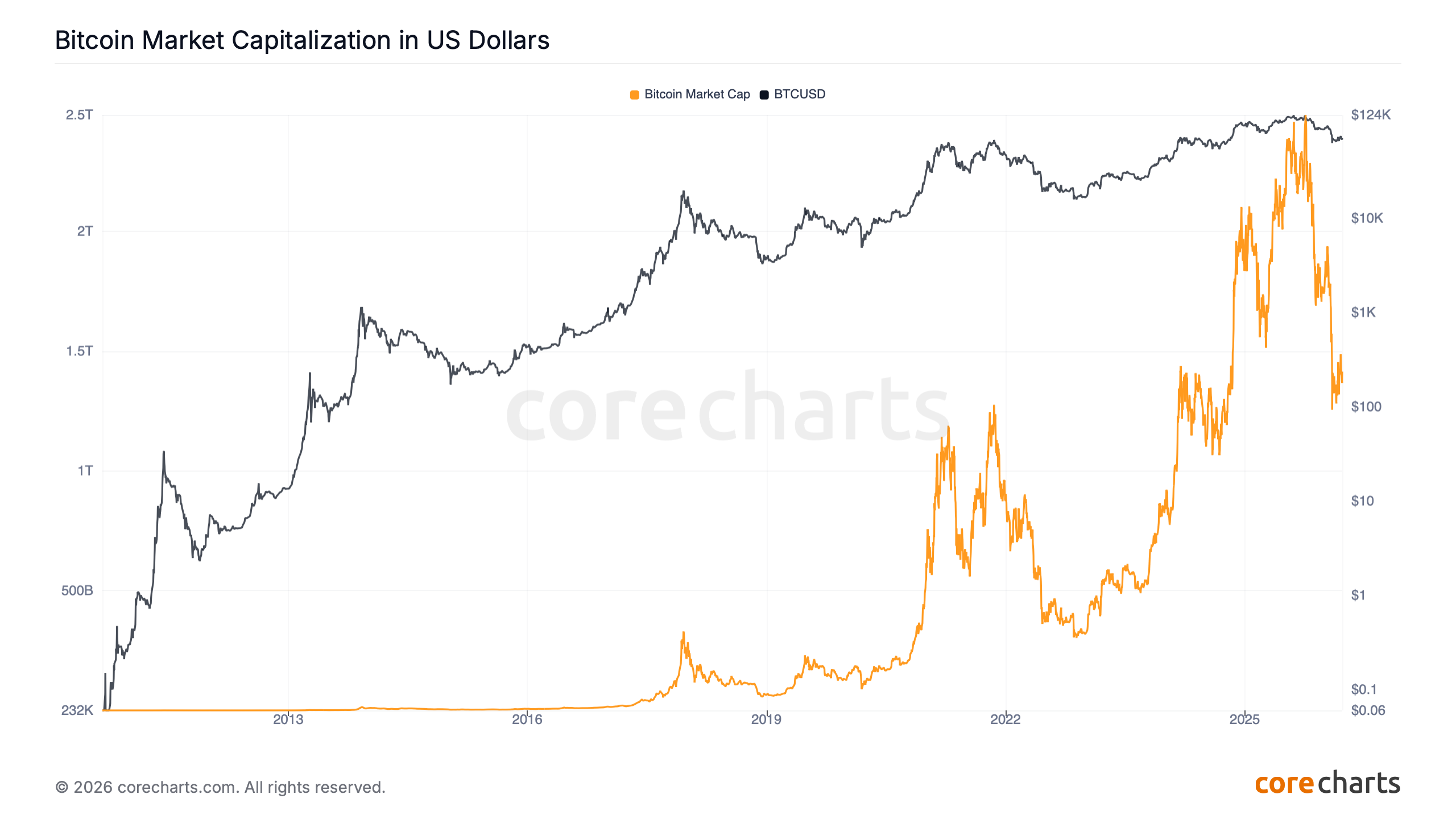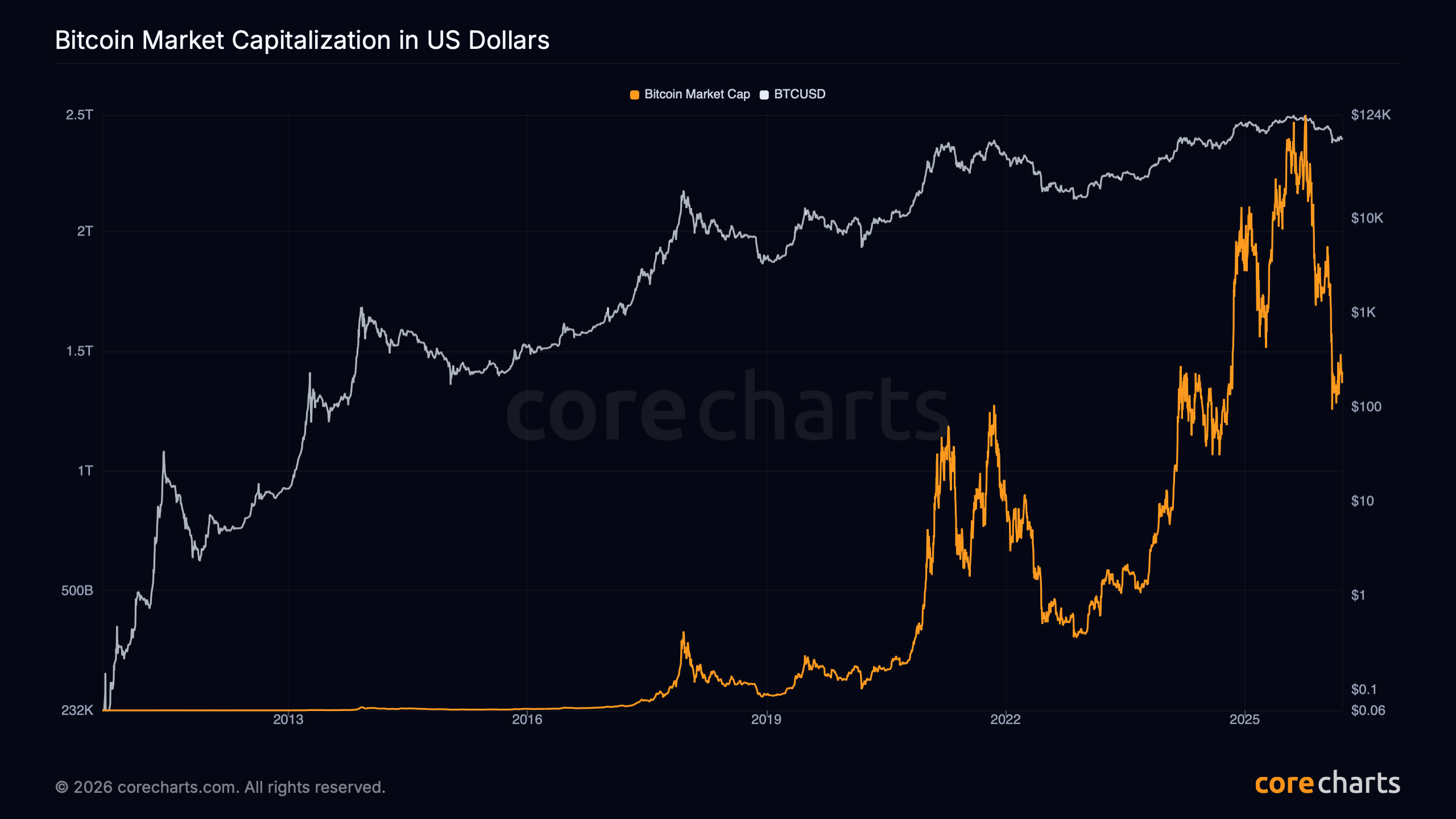 Bitcoin Market Capitalization in US Dollars is the dollar value of circulating BTC at the current market price.