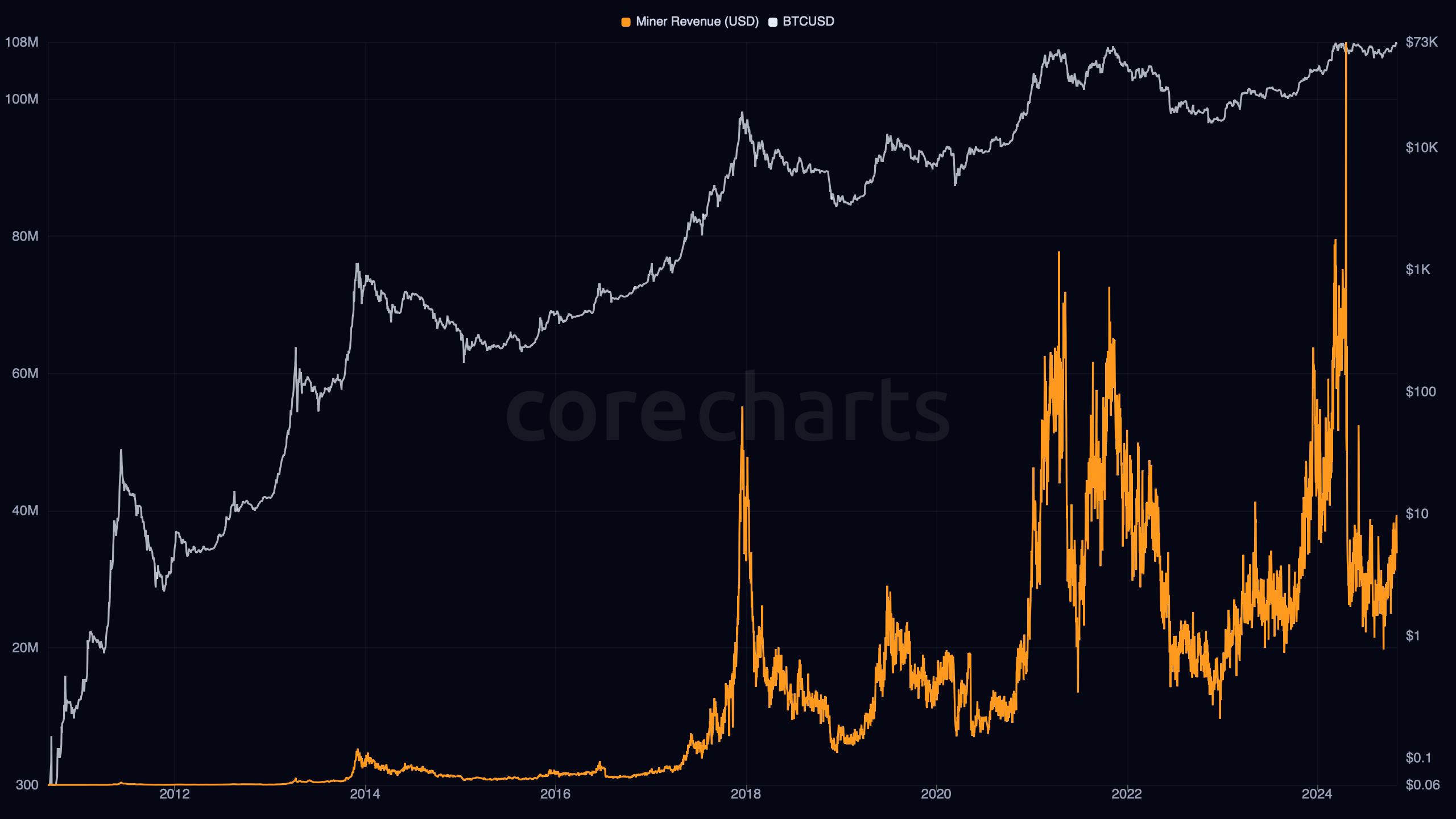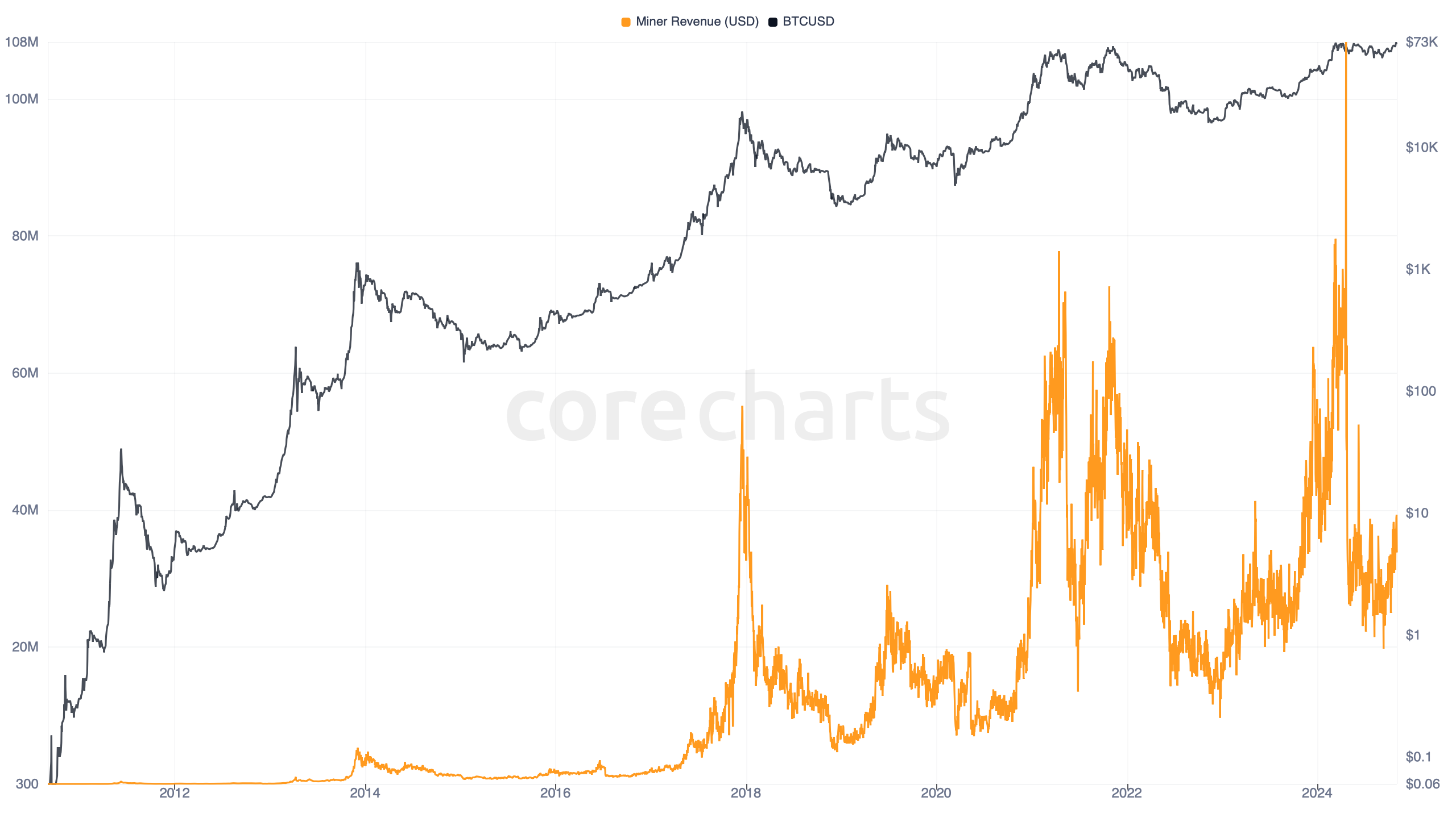 How much dollar-denominated revenue did miners earn from Bitcoin today?