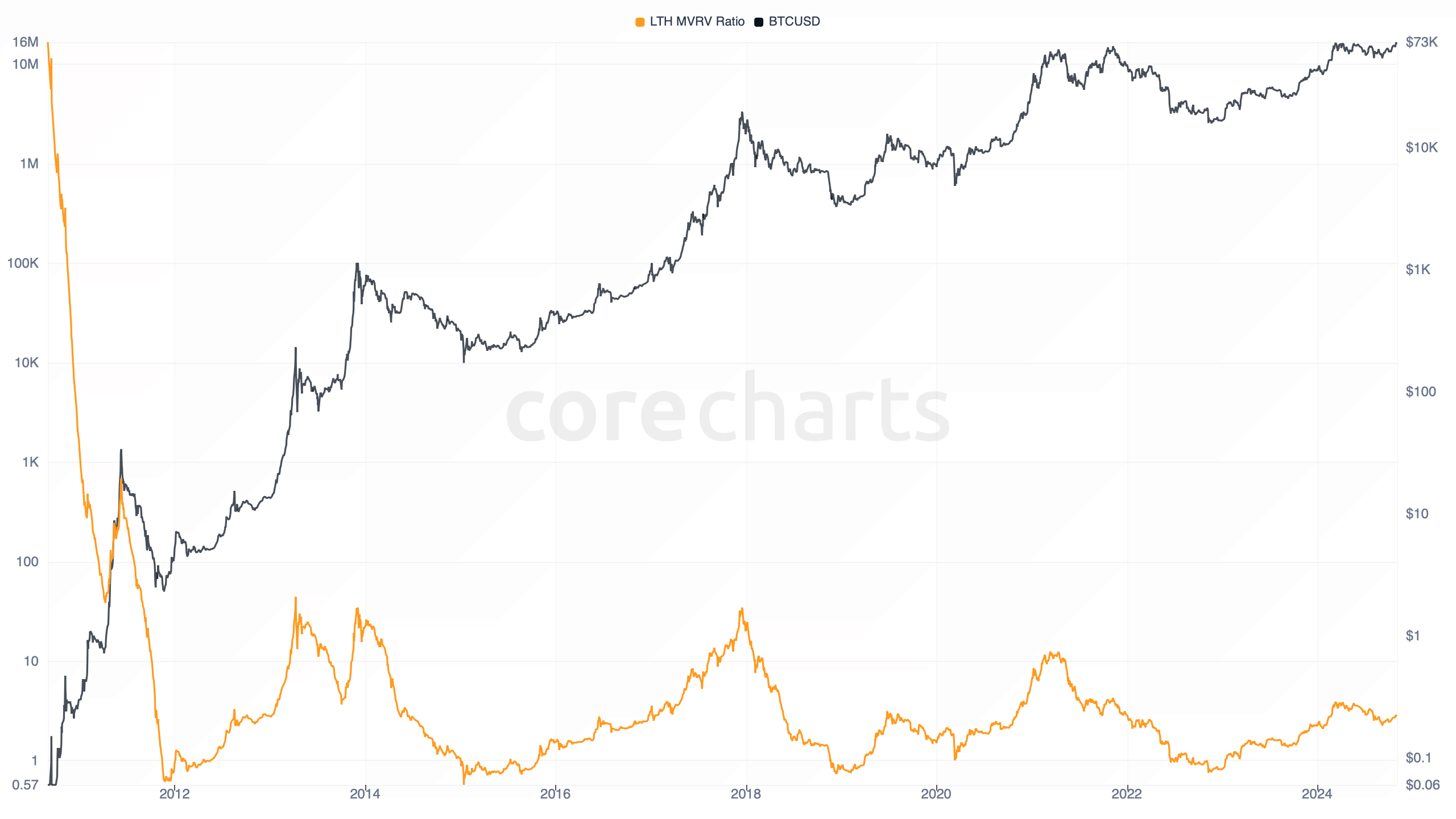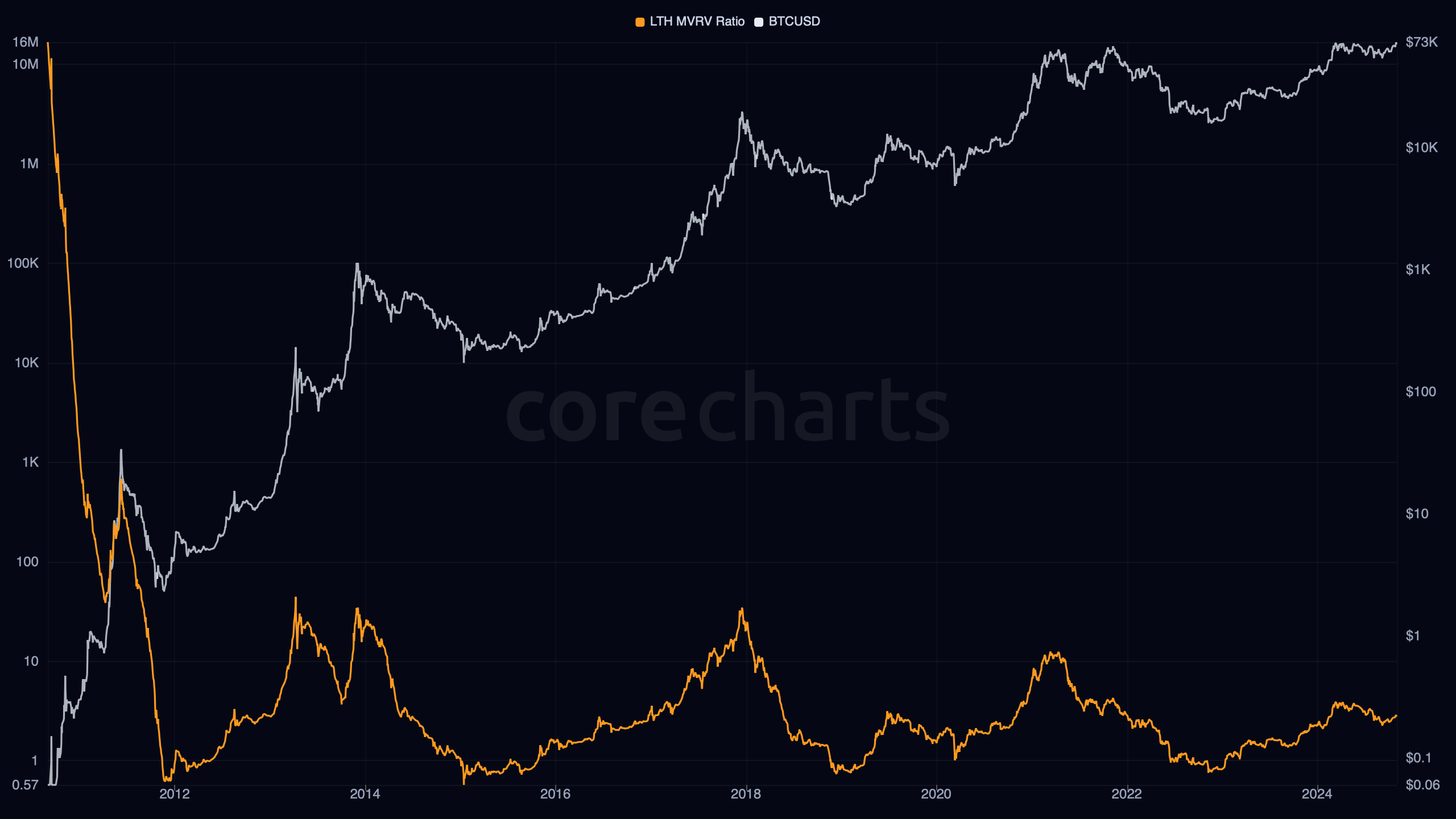 LTH MVRV Soft Ratio compares the market value of older supply with the realized value of that supply.