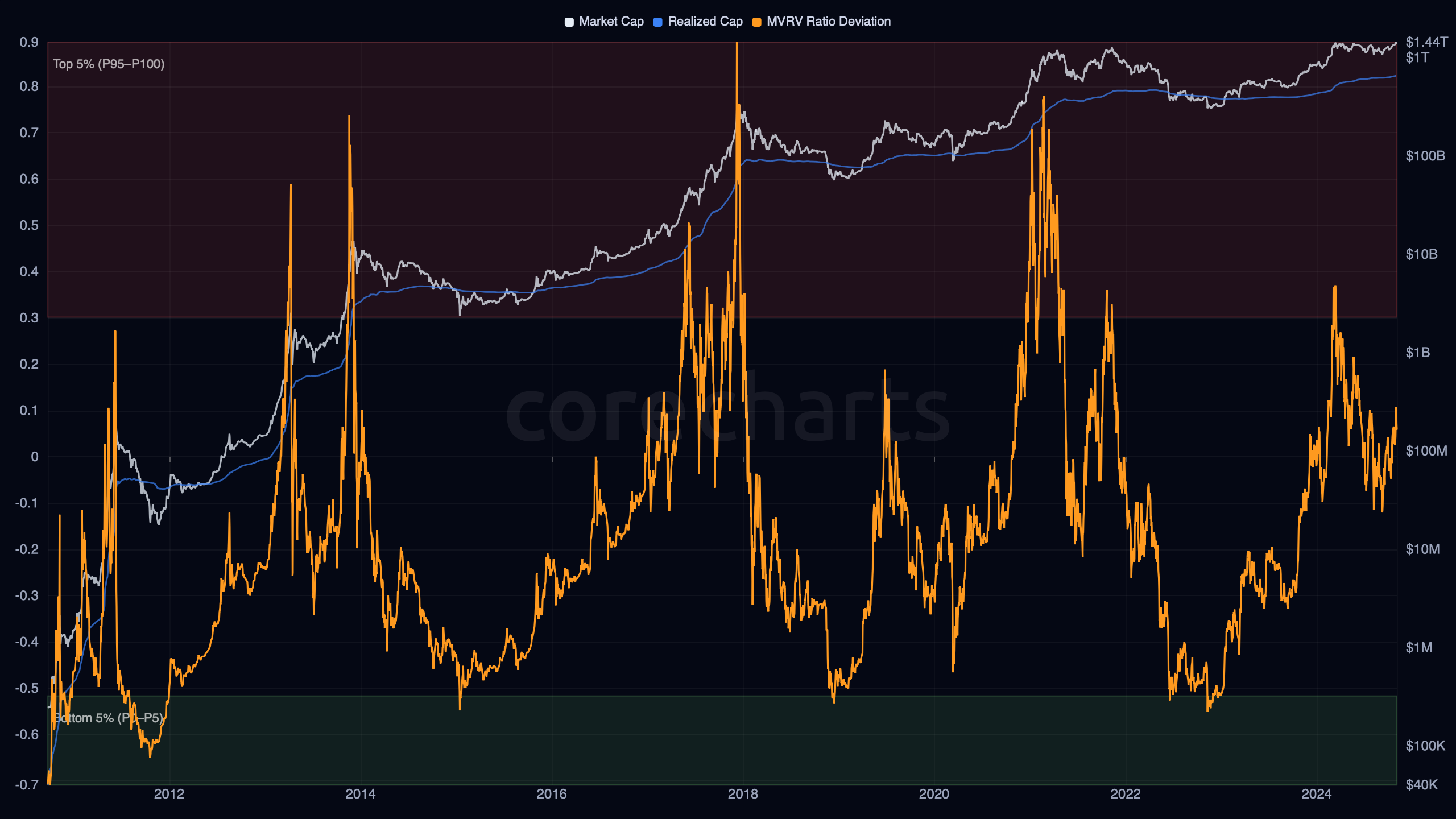 The signal is cleaner when the goal is to compare one cycle with another. Raw MVRV can look similar across periods that differ in market structure. A deviation score is better suited for judging extremity.