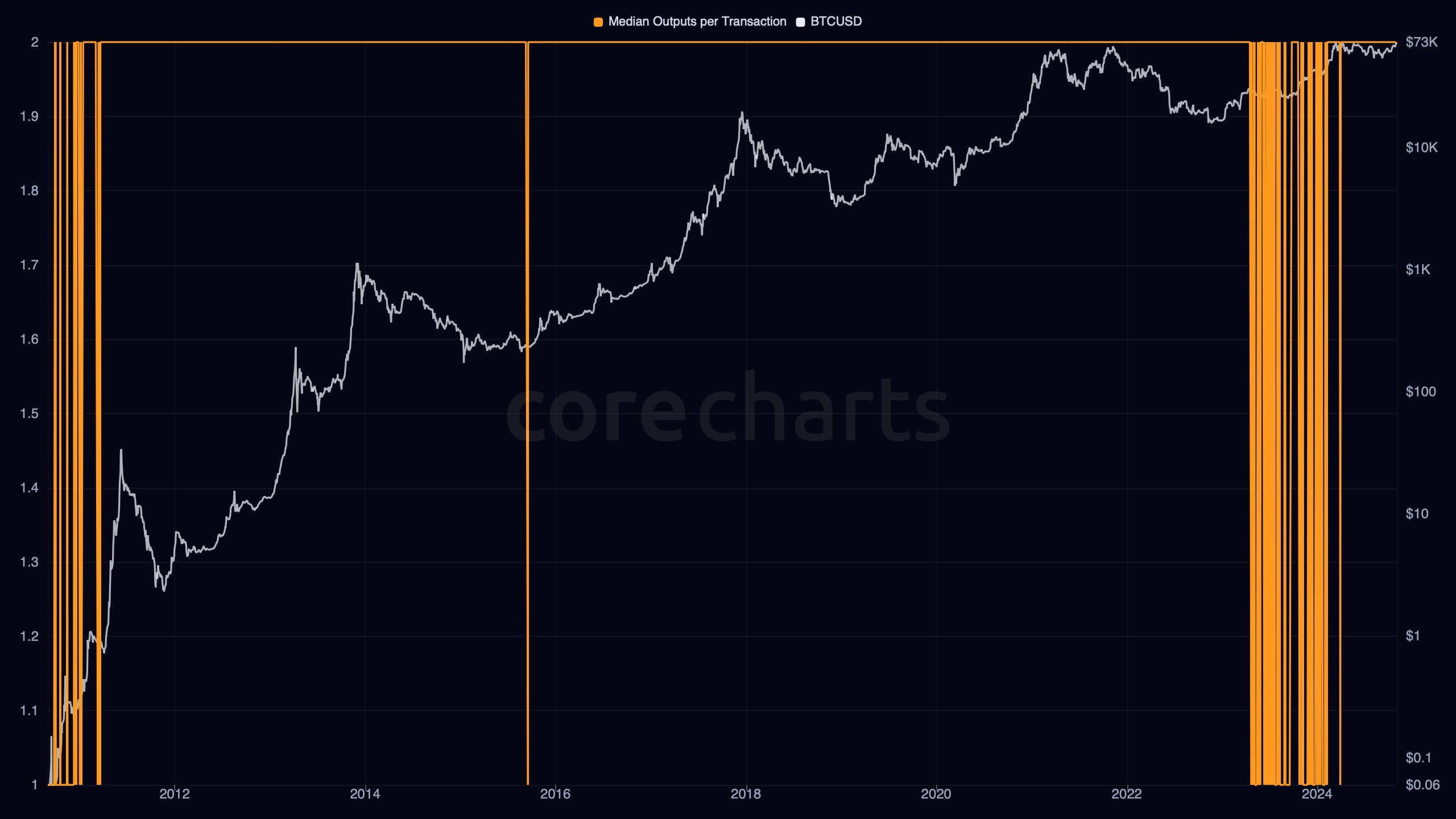 Bitcoin Median Outputs per Transaction shows the median number of outputs created by Bitcoin transactions on a given day.