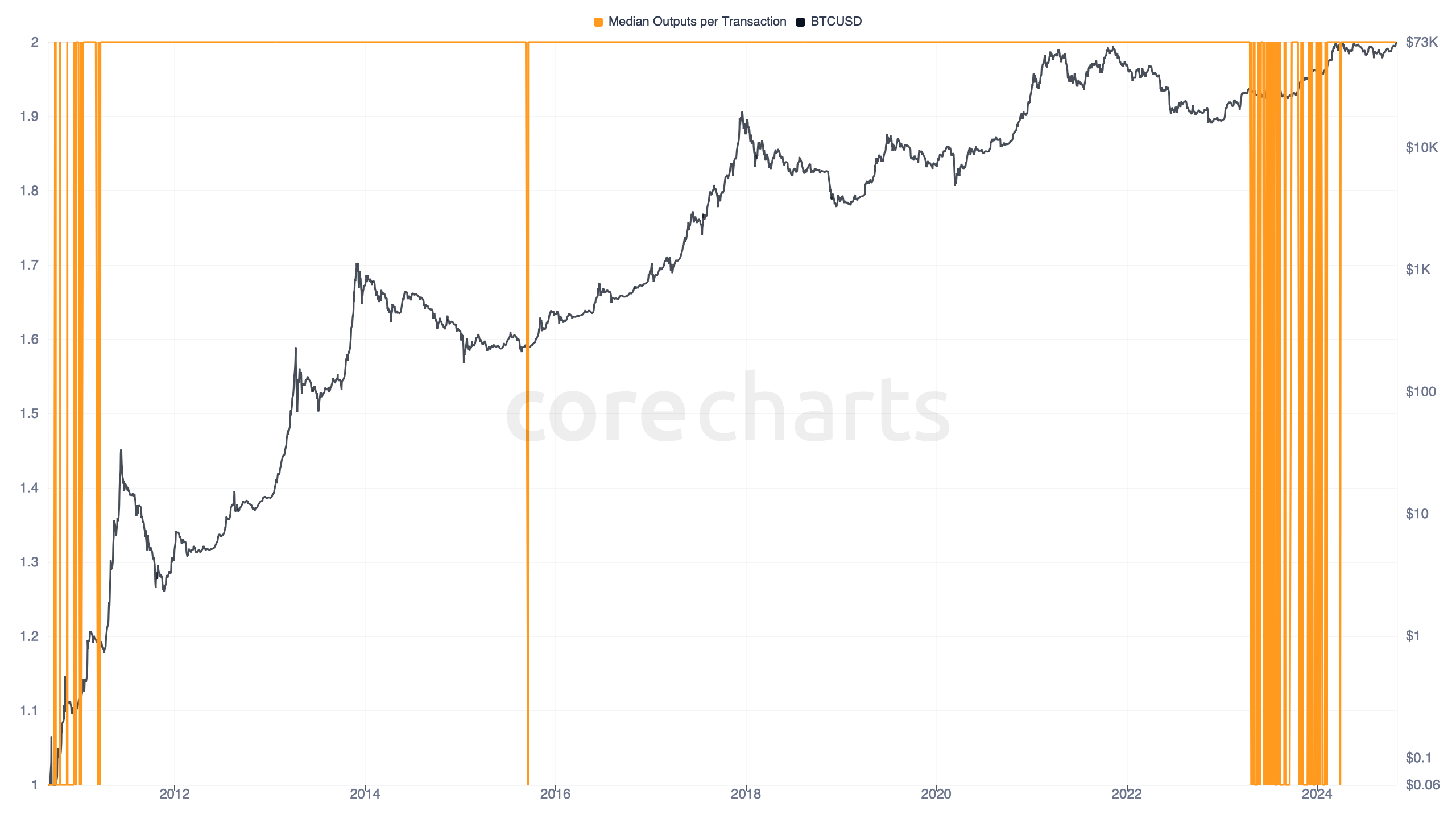 Bitcoin Median Outputs per Transaction¶