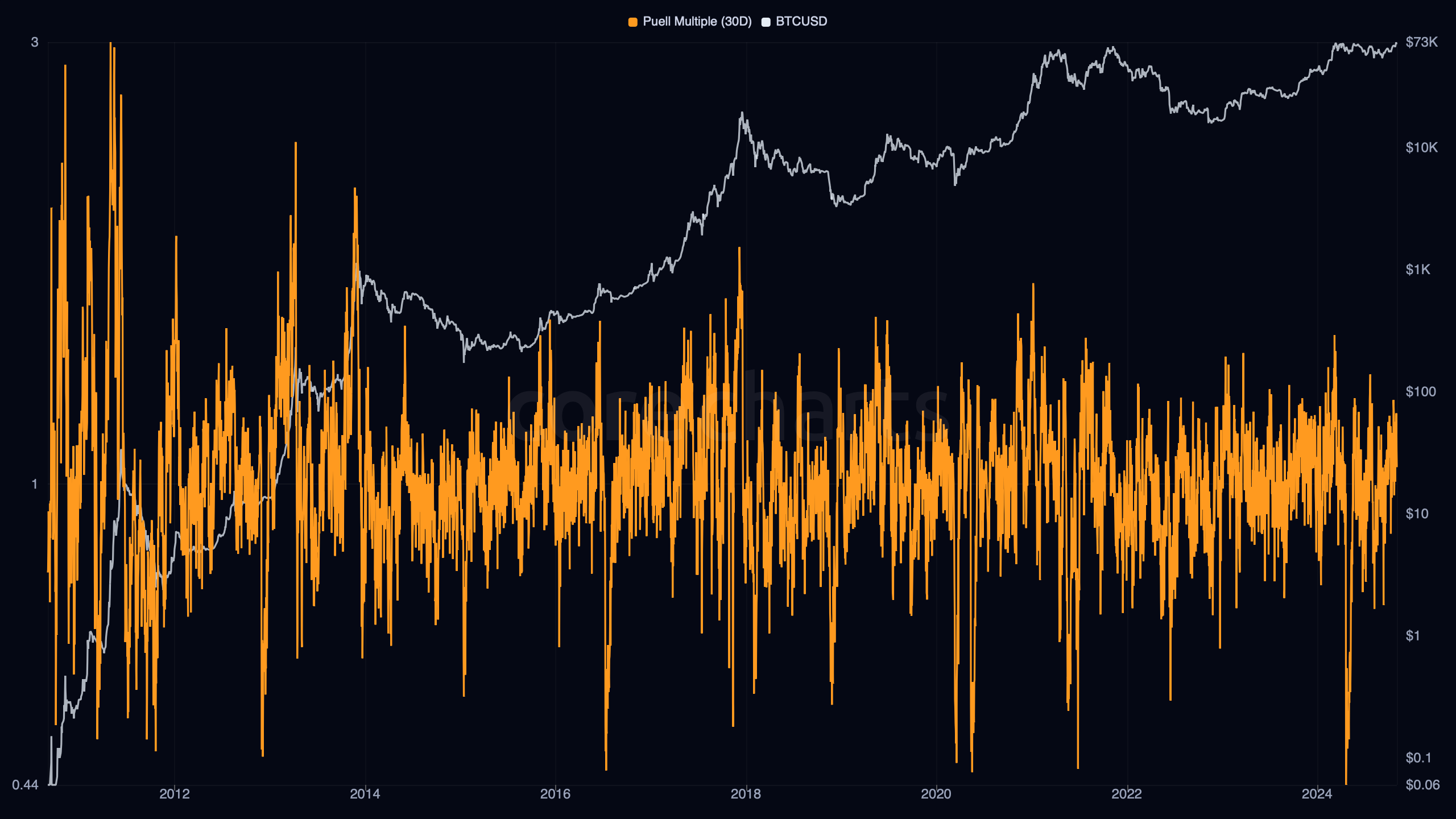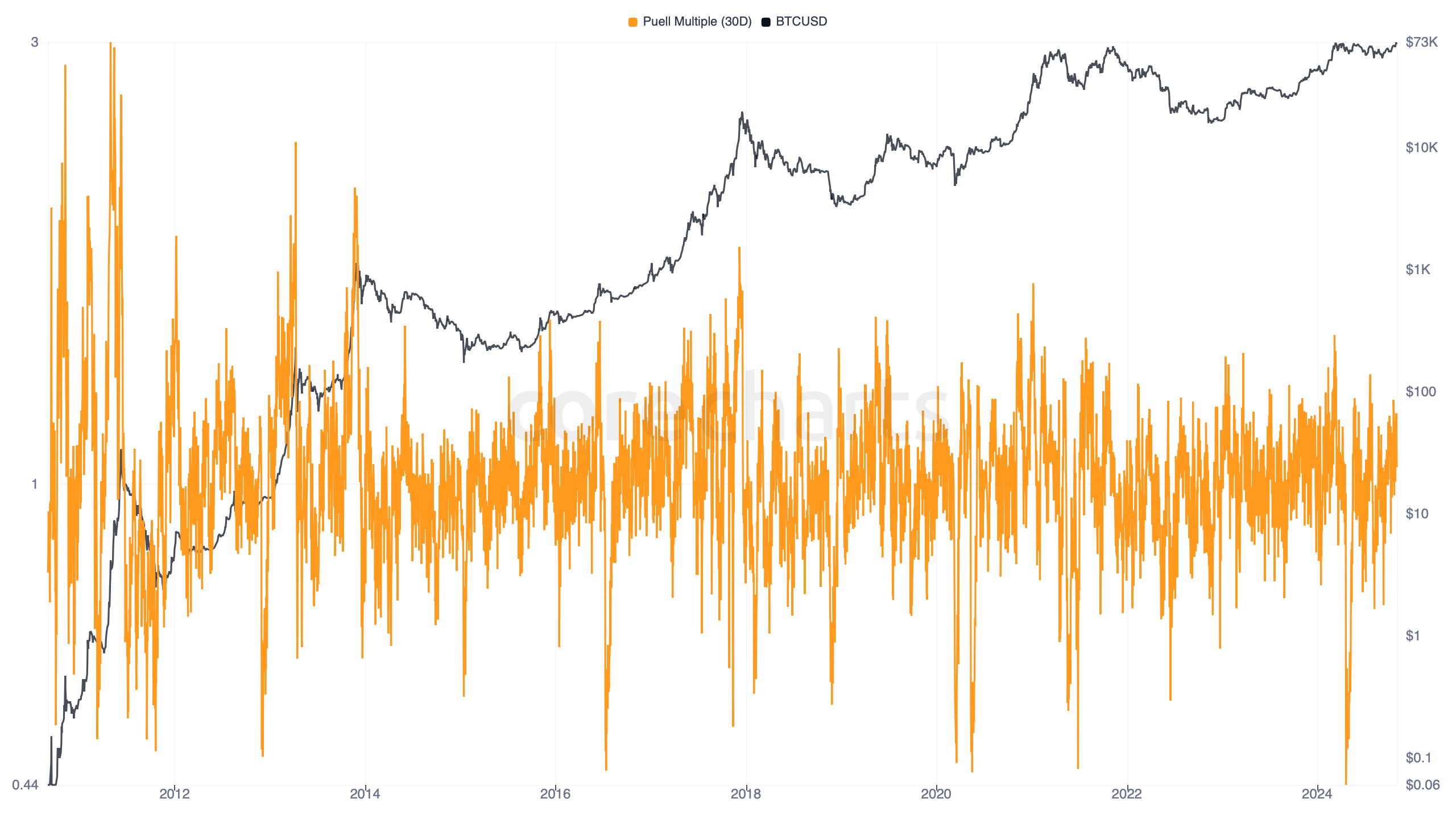 Bitcoin Puell Multiple, 30-Day compares today’s daily issuance value in USD with the average daily issuance value over the last 30 days.