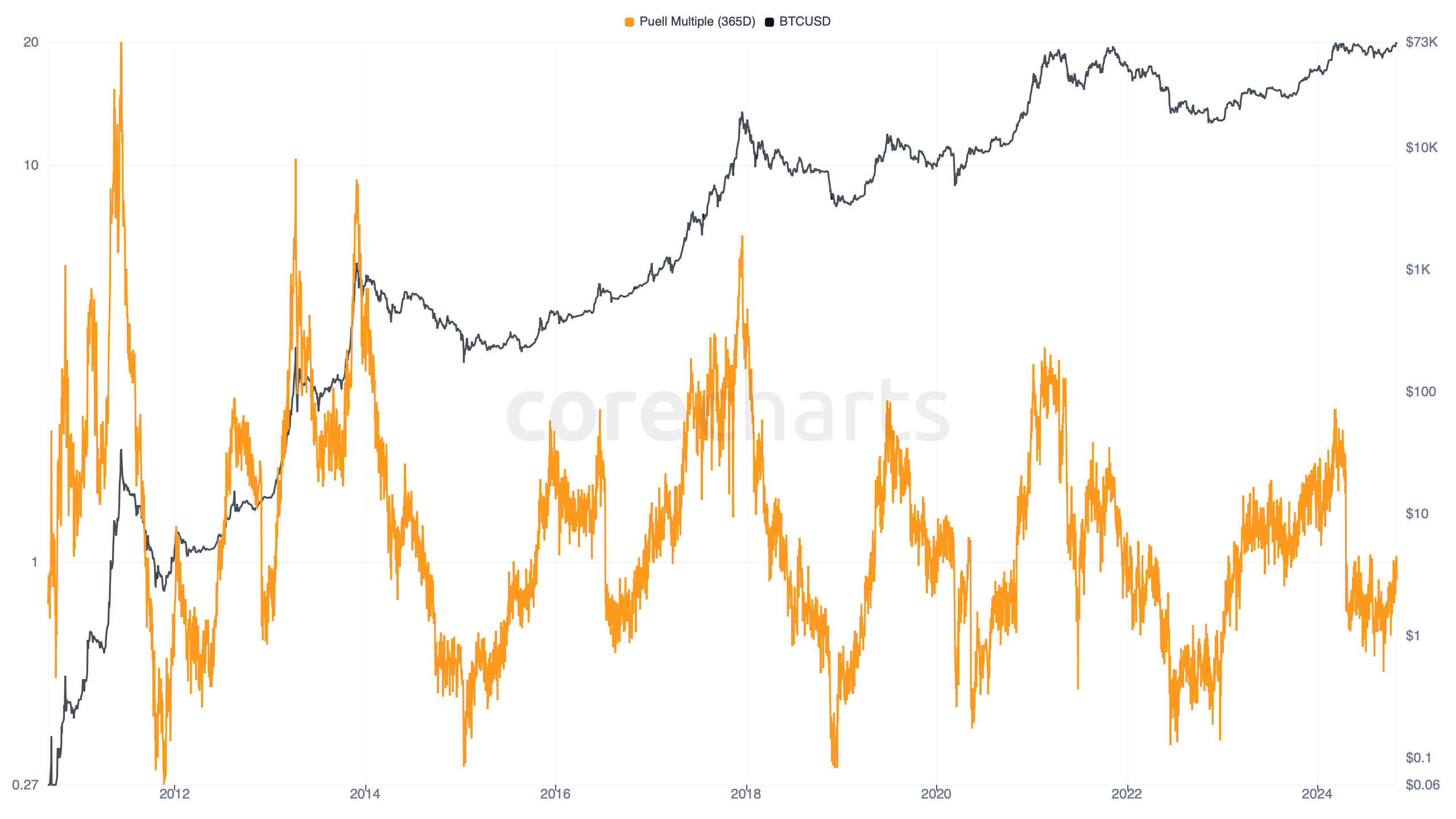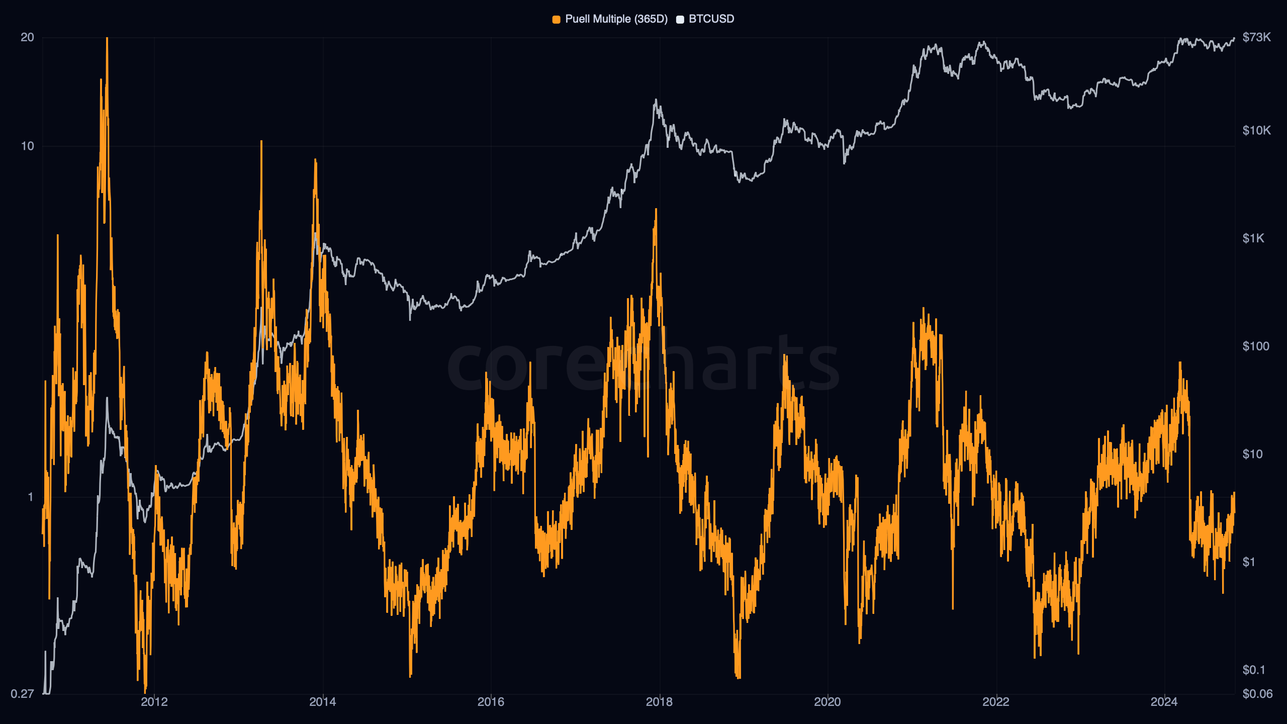 Bitcoin Puell Multiple, 365-Day compares today’s daily issuance value in USD with the average daily issuance value over the last 365 days.