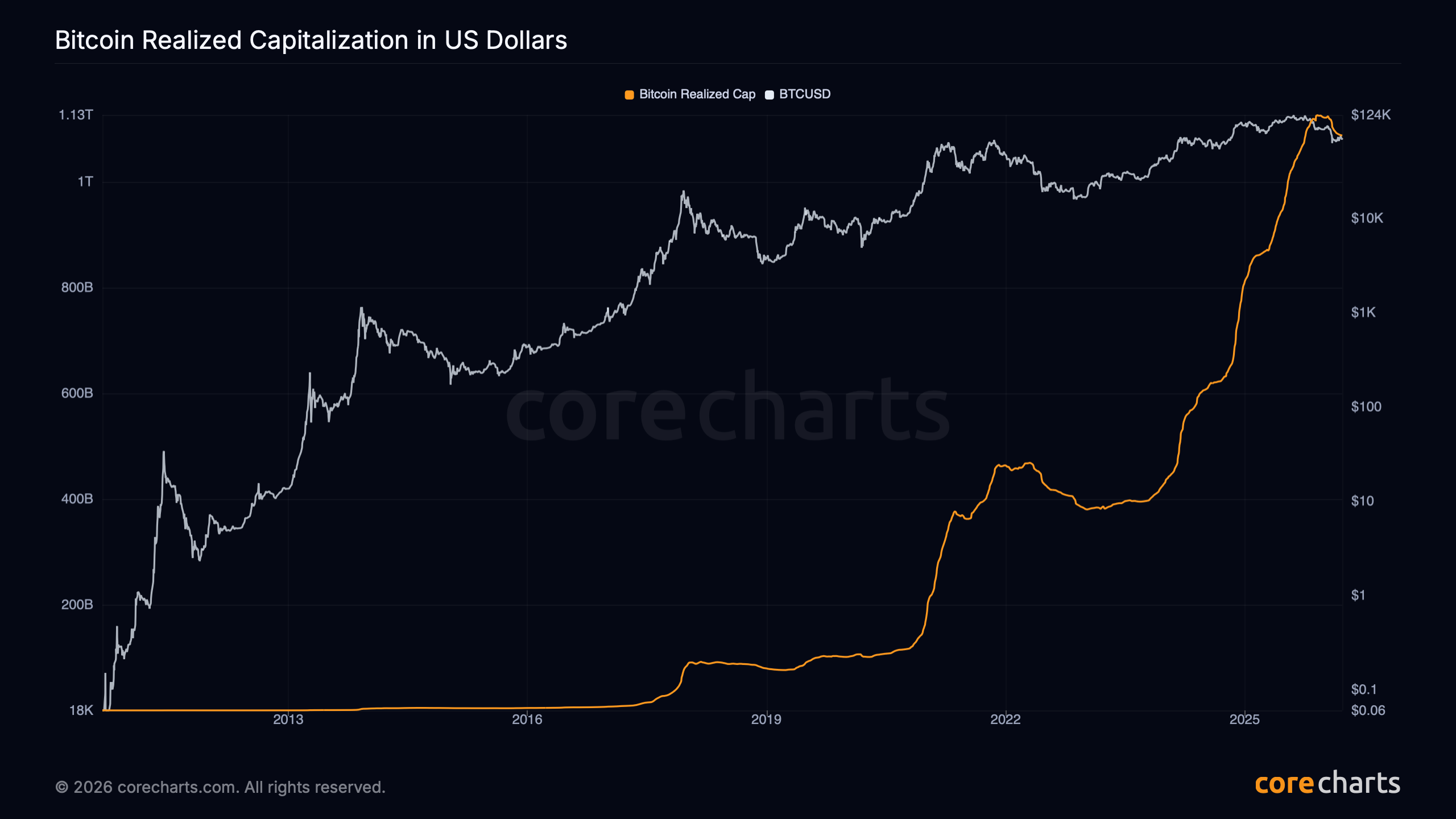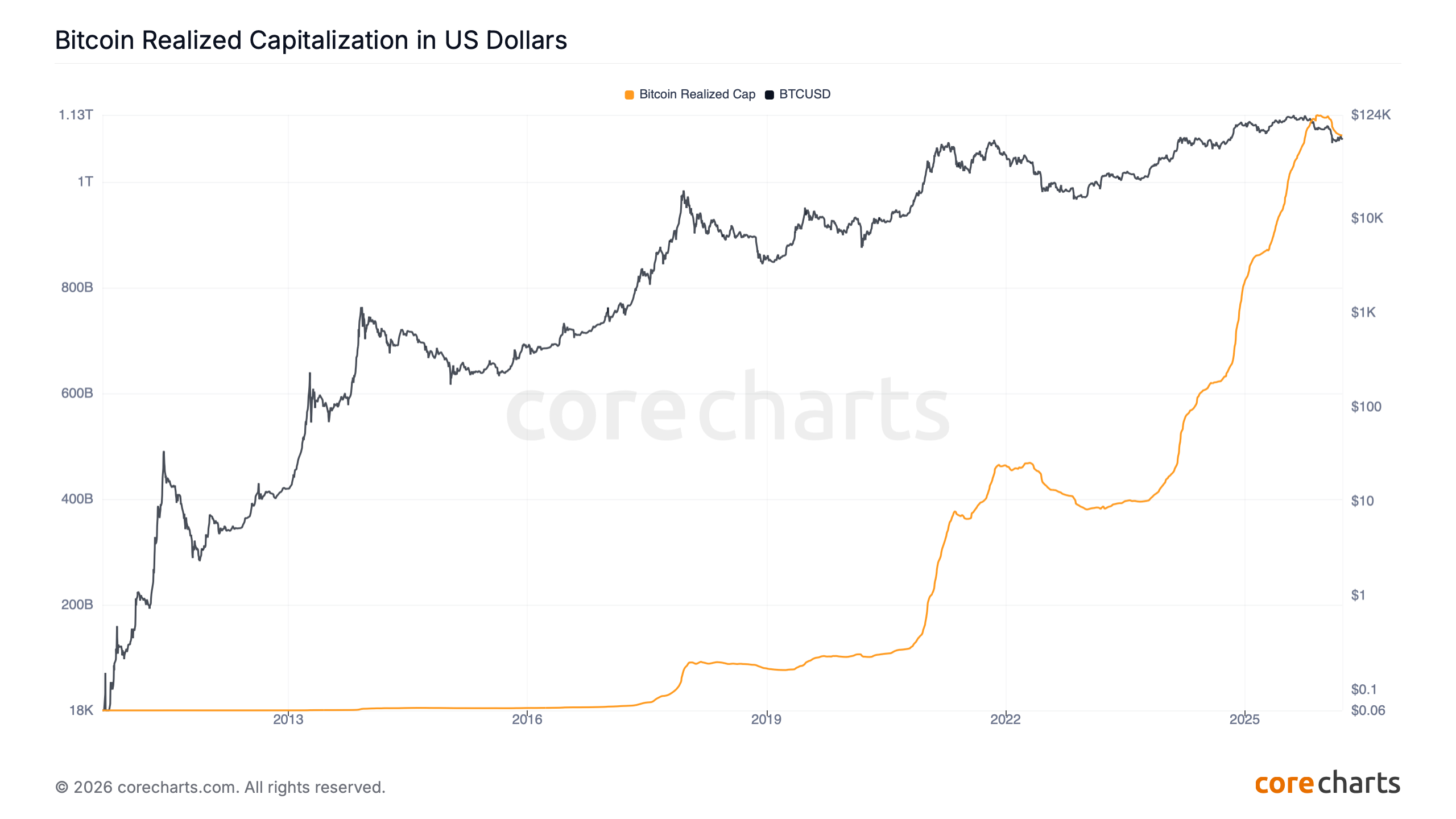 A coin that last moved when BTC traded at $20,000 contributes less to Realized Cap than the same coin moving at $60,000. A coin that does not move keeps its prior valuation. Because of that, the series changes only when supply is repriced through actual on-chain transfer activity.
