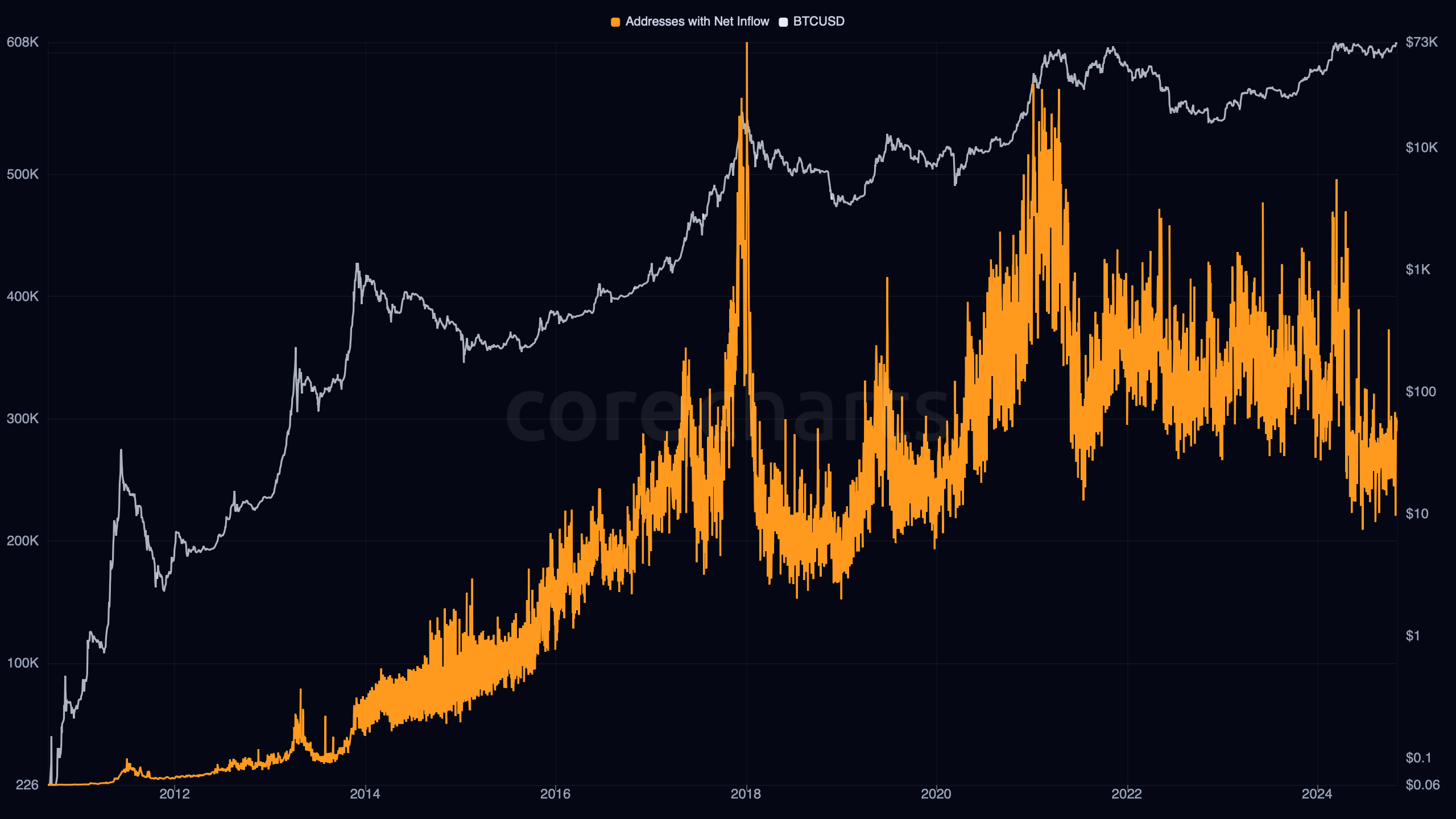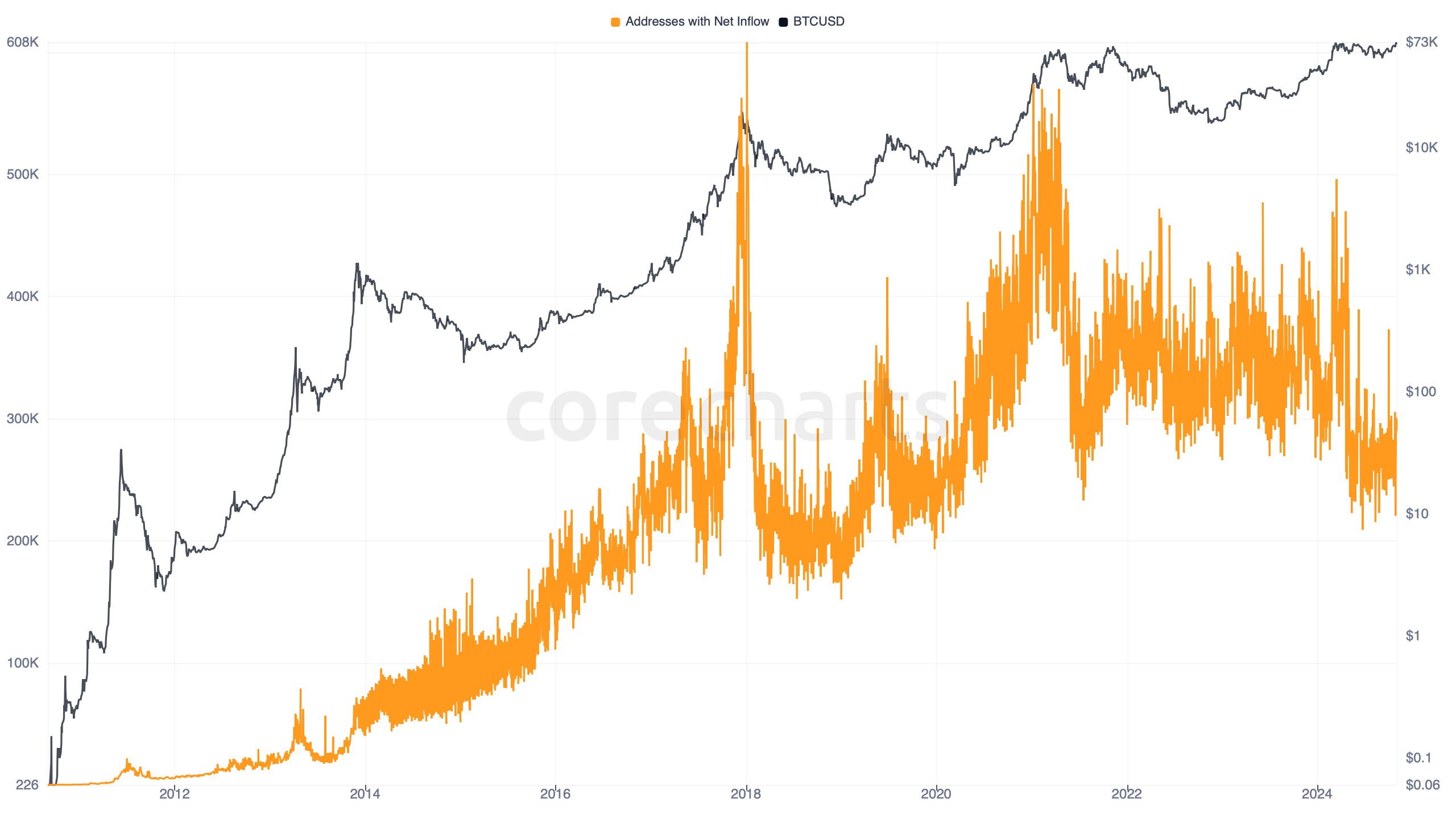 Bitcoin Addresses with Net Inflow counts addresses whose net balance change over the observed day was positive.