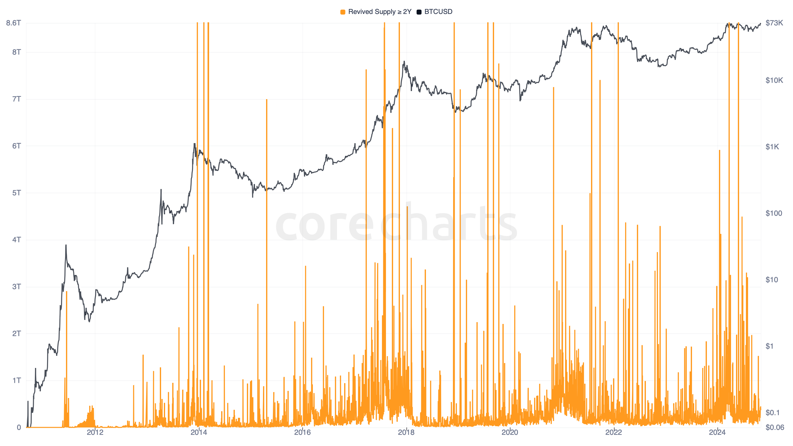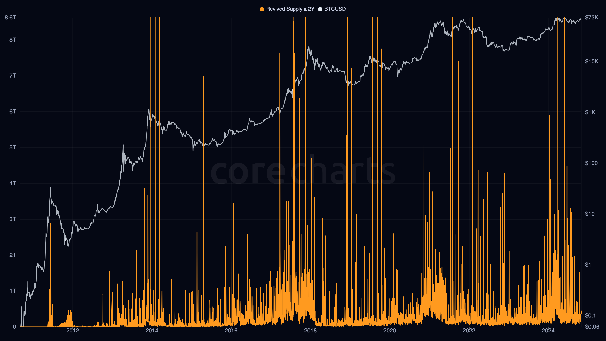 Revived-supply style metrics emerged from the broader Bitcoin coin-age framework. Once analysts began measuring spent-output age, it became natural to isolate thresholds such as 1 year, 2 years, 5 years, or 10 years and ask how much dormant supply above those cutoffs was being spent.