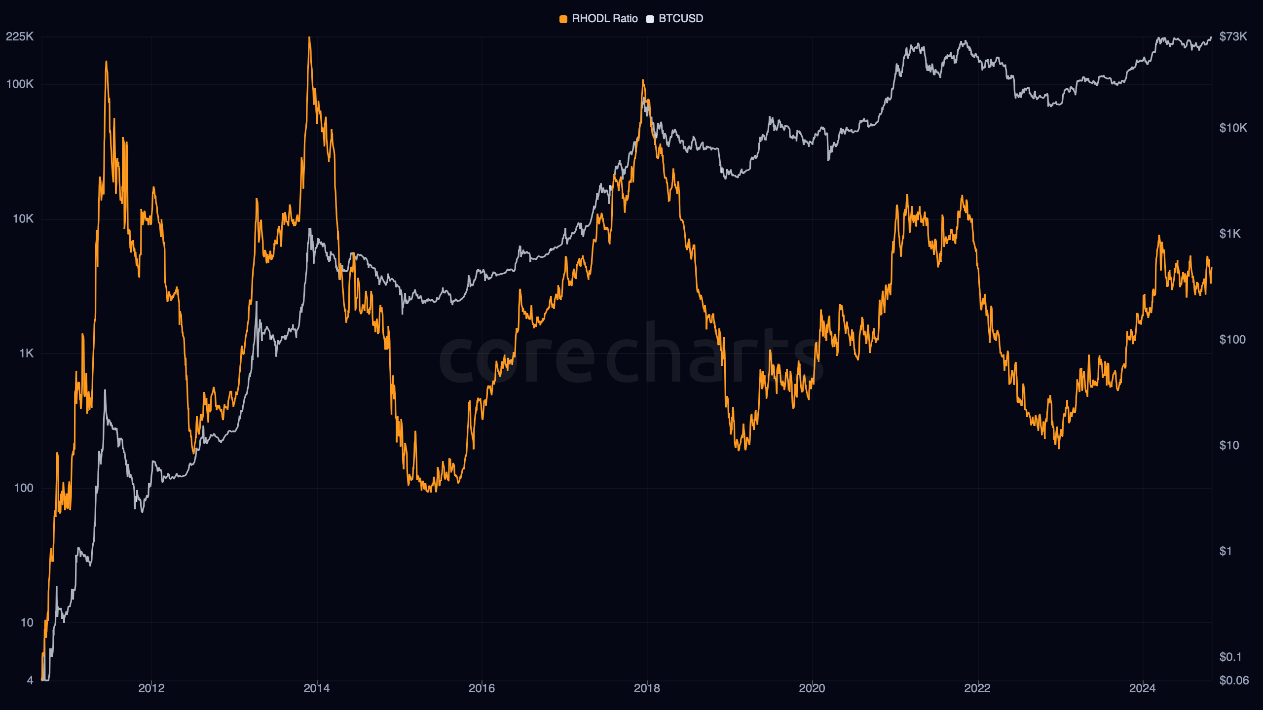 Bitcoin RHODL Ratio compares the realized value of very recently moved coins with the realized value of coins held for one to two years, then scales that comparison by Bitcoin’s age as a market.