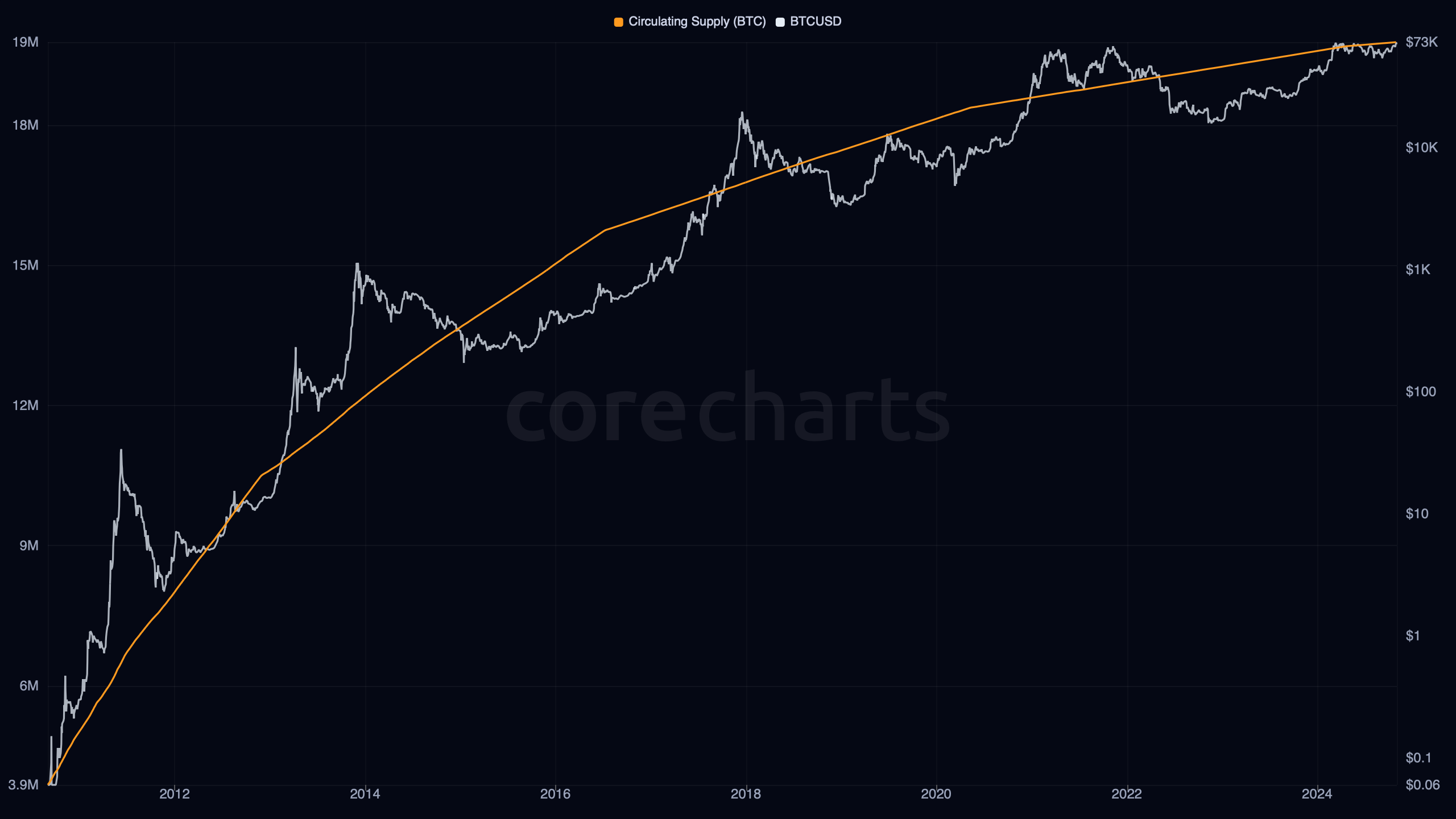- Circulating Supply (BTC) is the same series in standard display form.