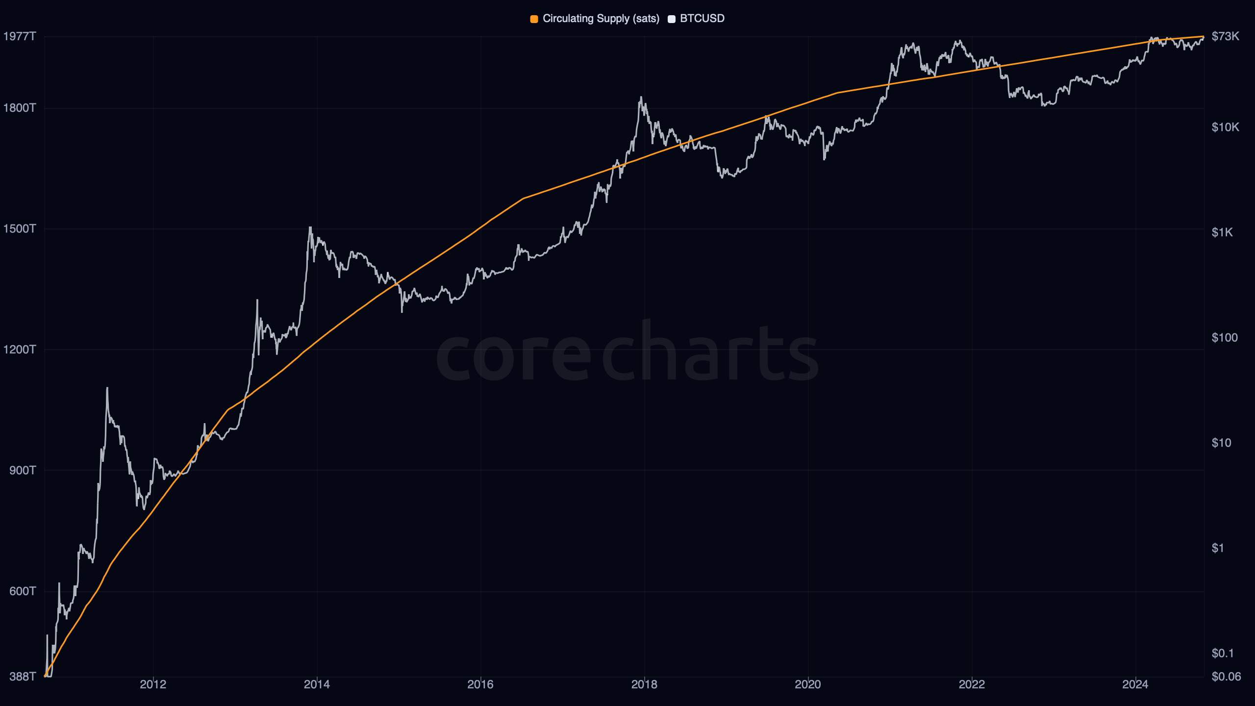 Bitcoin Circulating Supply shows how many satoshis have been issued into circulation by the Bitcoin protocol up to the current date.