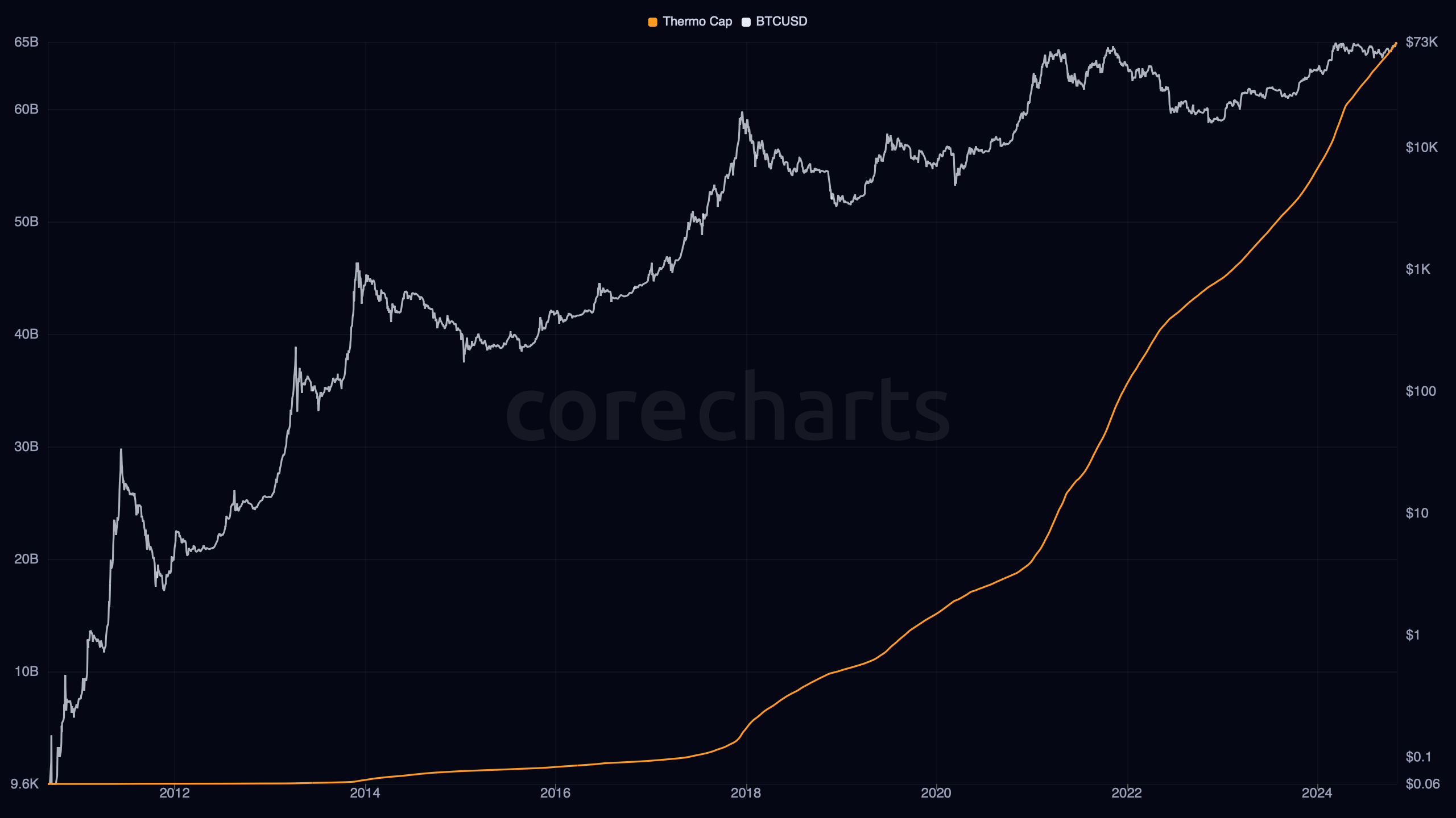 A rising Thermo Cap simply means more subsidy has been distributed through time. Since subsidy is paid every day, the series grows continuously, though its growth rate slows after each halving.