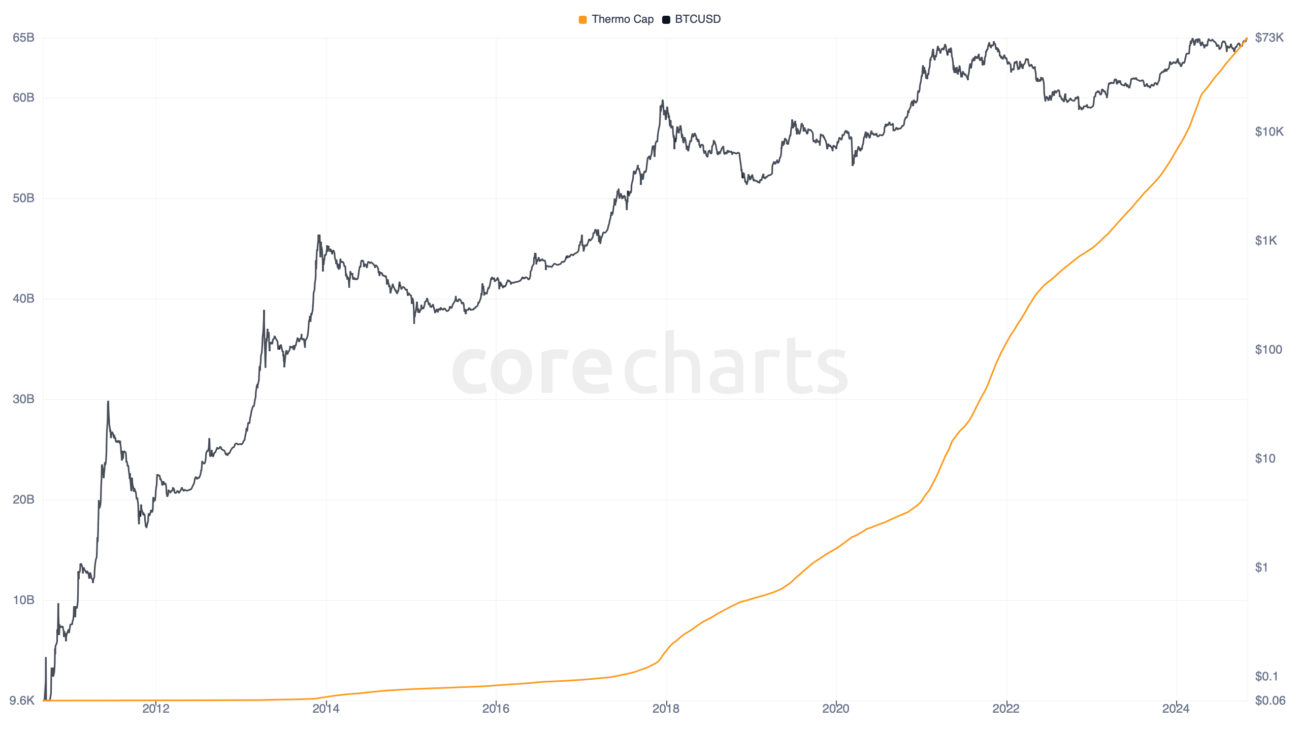 Thermo Cap is useful when the goal is to compare Bitcoin’s current market valuation with the historical value of coins paid to miners.