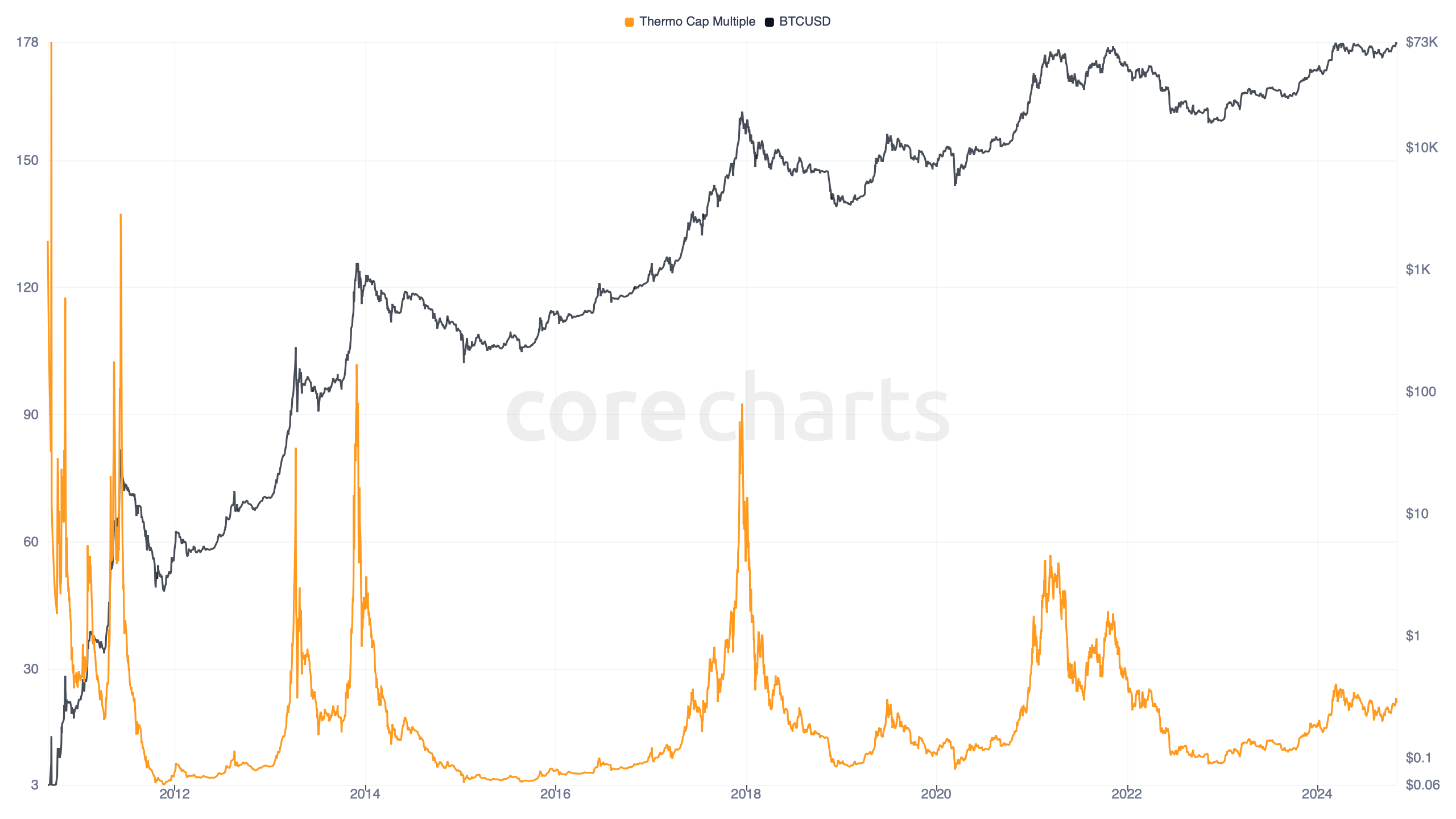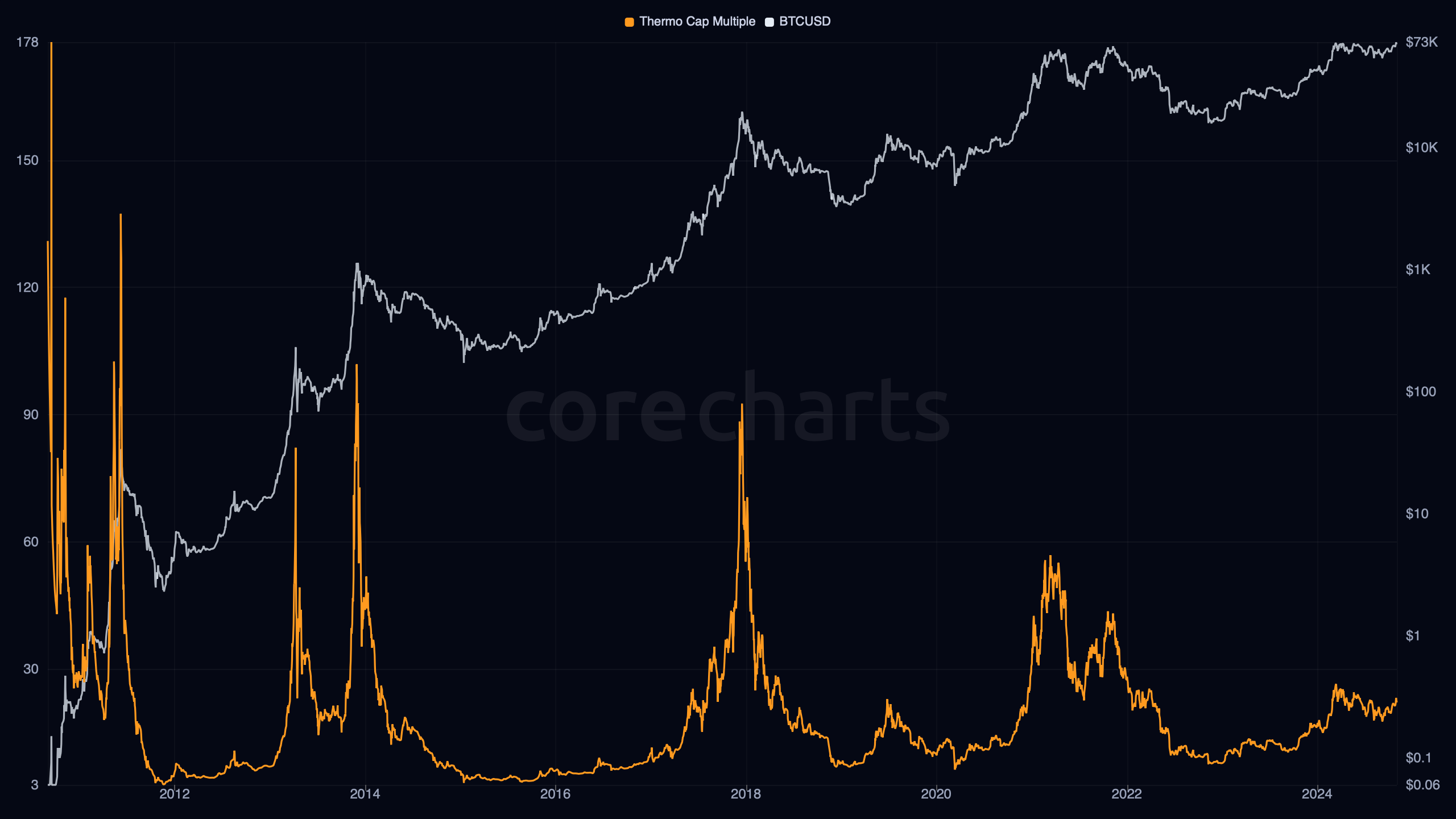 Bitcoin Thermo Cap Multiple compares Bitcoin’s current market capitalization with Thermo Cap.