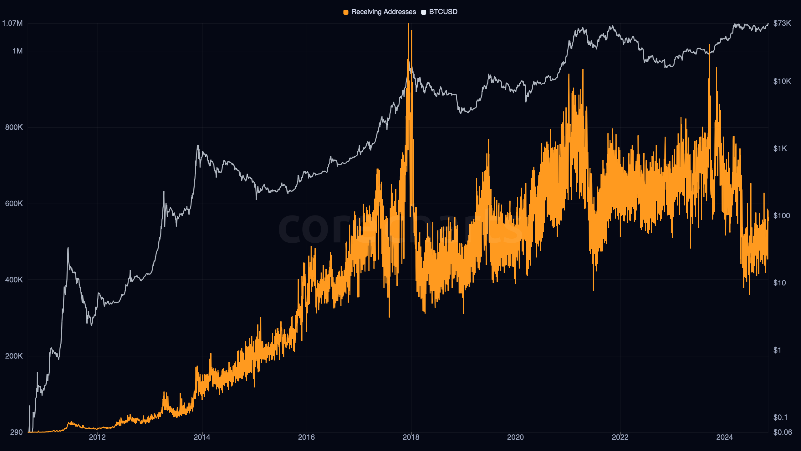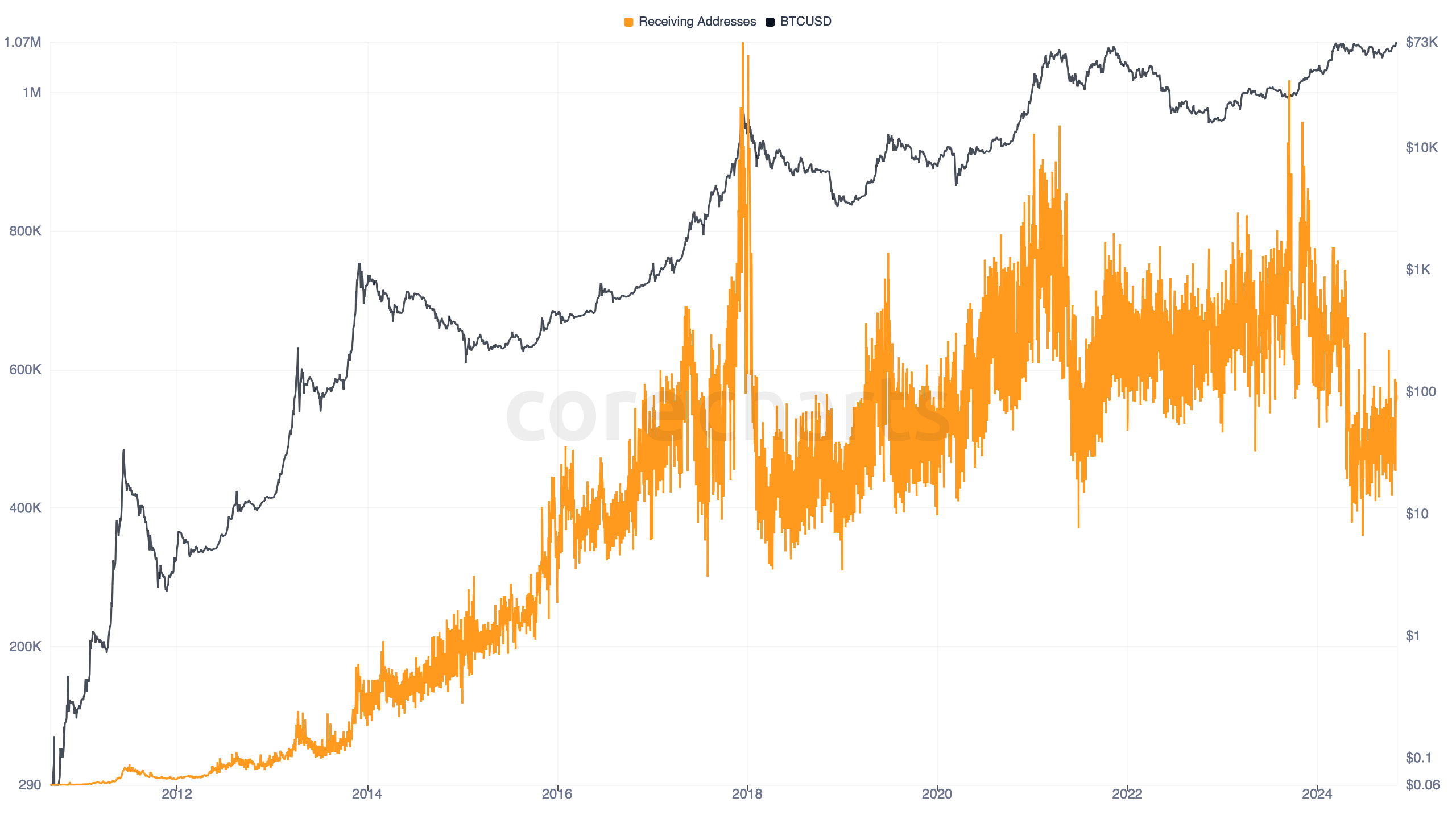 Bitcoin Receiving Addresses counts the unique addresses that appeared on the output side of transactions during the day.