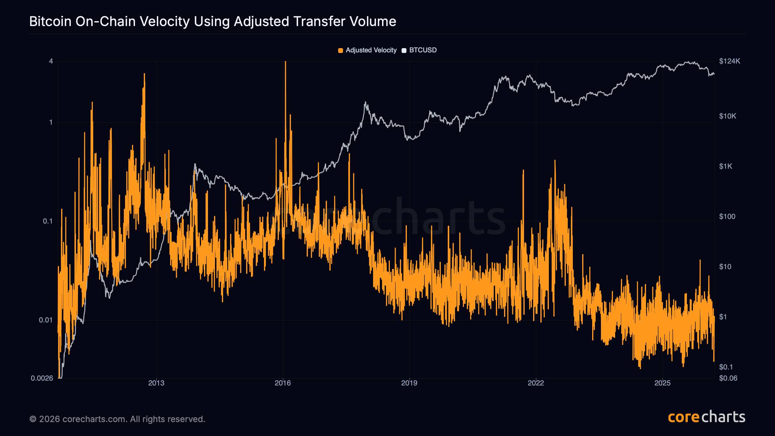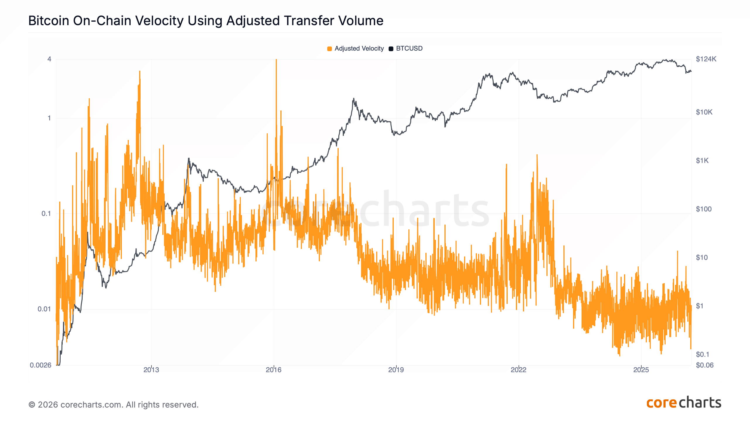 The difference from raw velocity lies in the numerator. CoreCharts uses an adjusted transfer estimate intended to reduce noise from flows that do not reflect clean economic settlement. The denominator remains Market Cap.