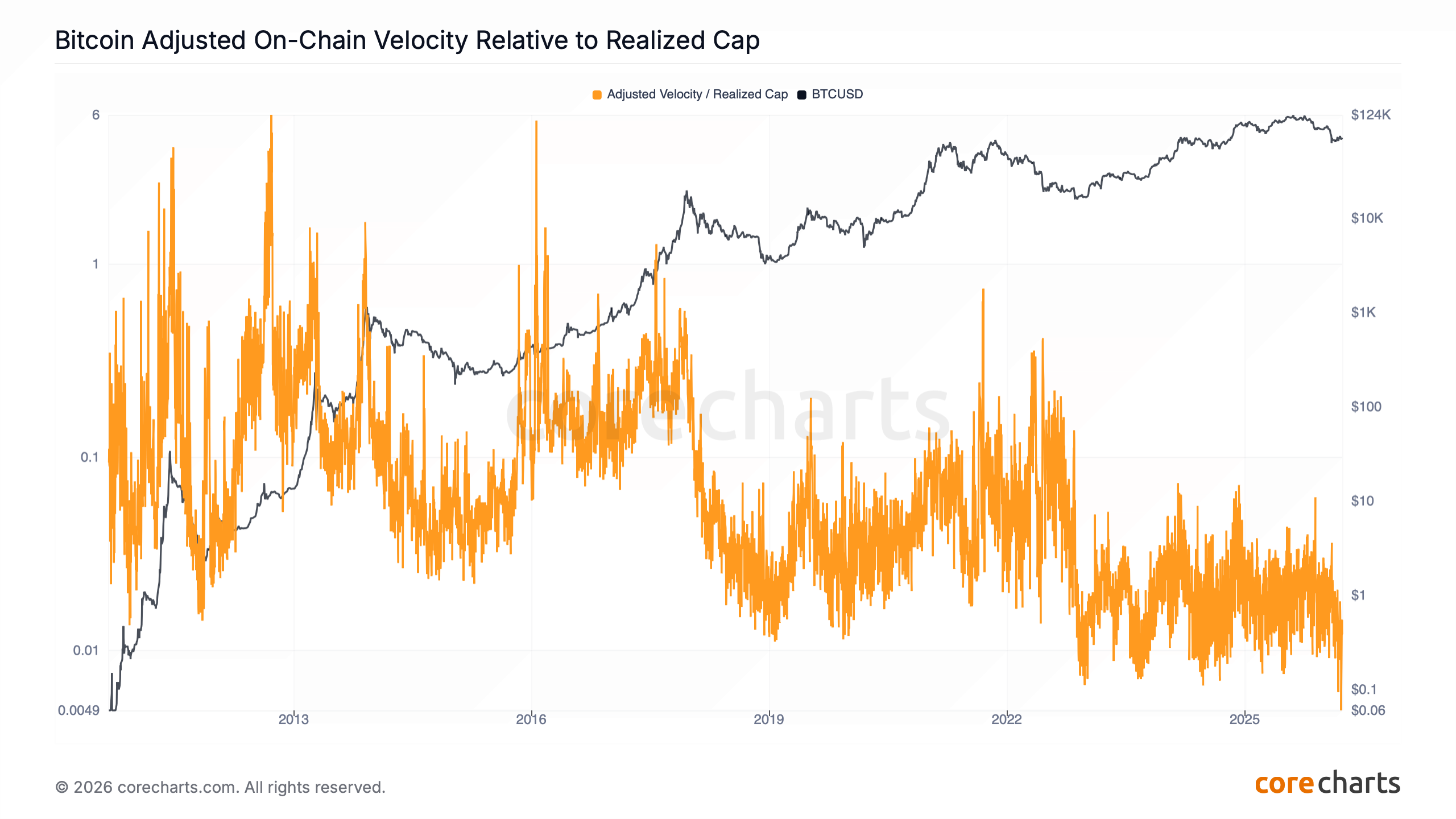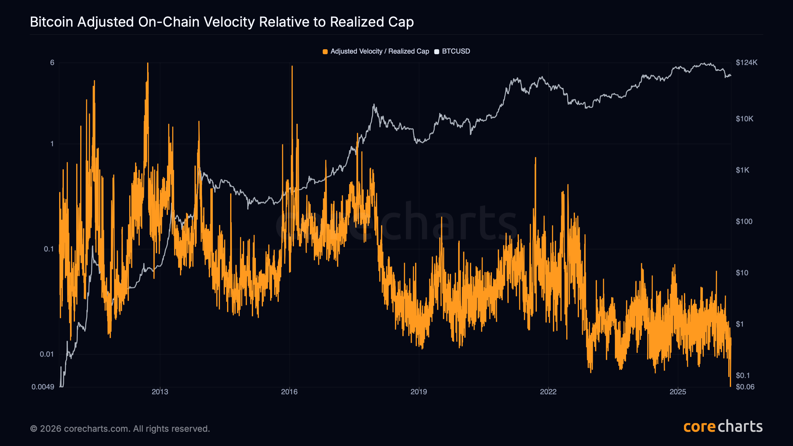 Bitcoin Adjusted On-Chain Velocity Relative to Realized Cap¶