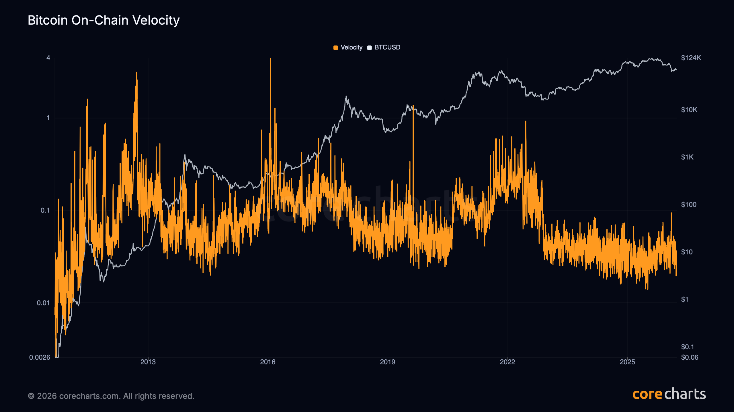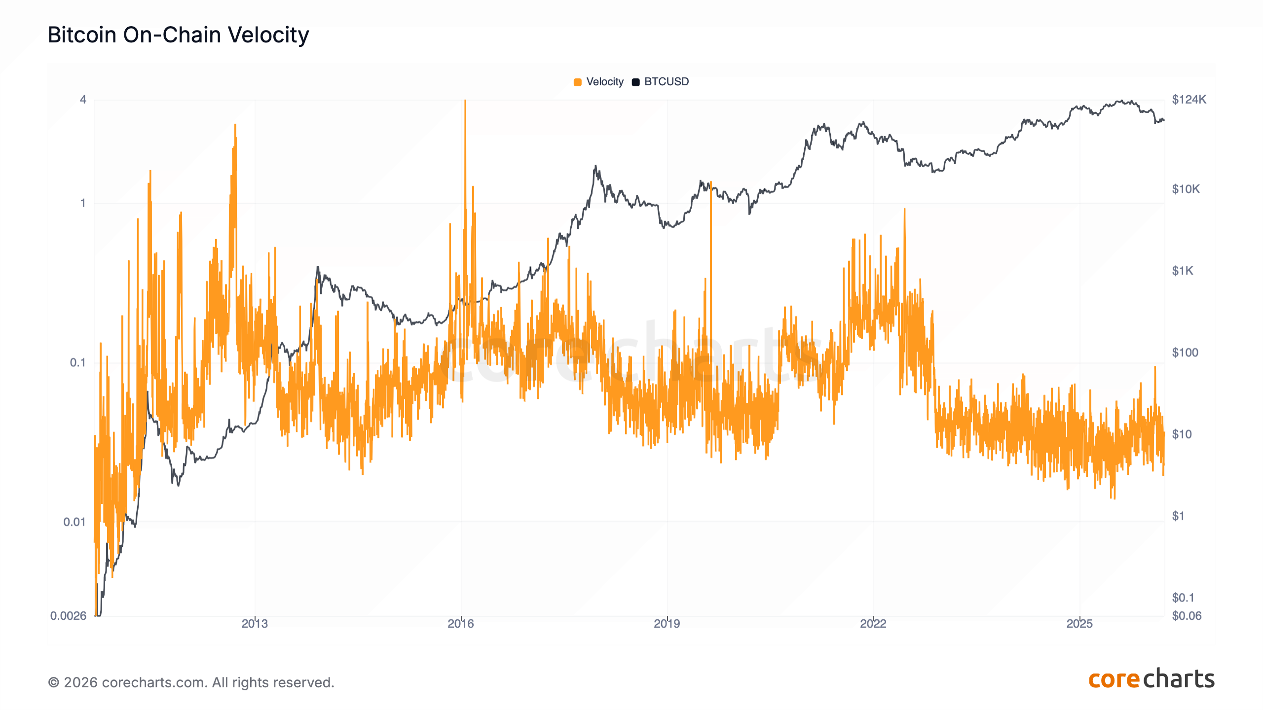 Bitcoin On-Chain Velocity compares on-chain transfer volume with Bitcoin Market Cap.